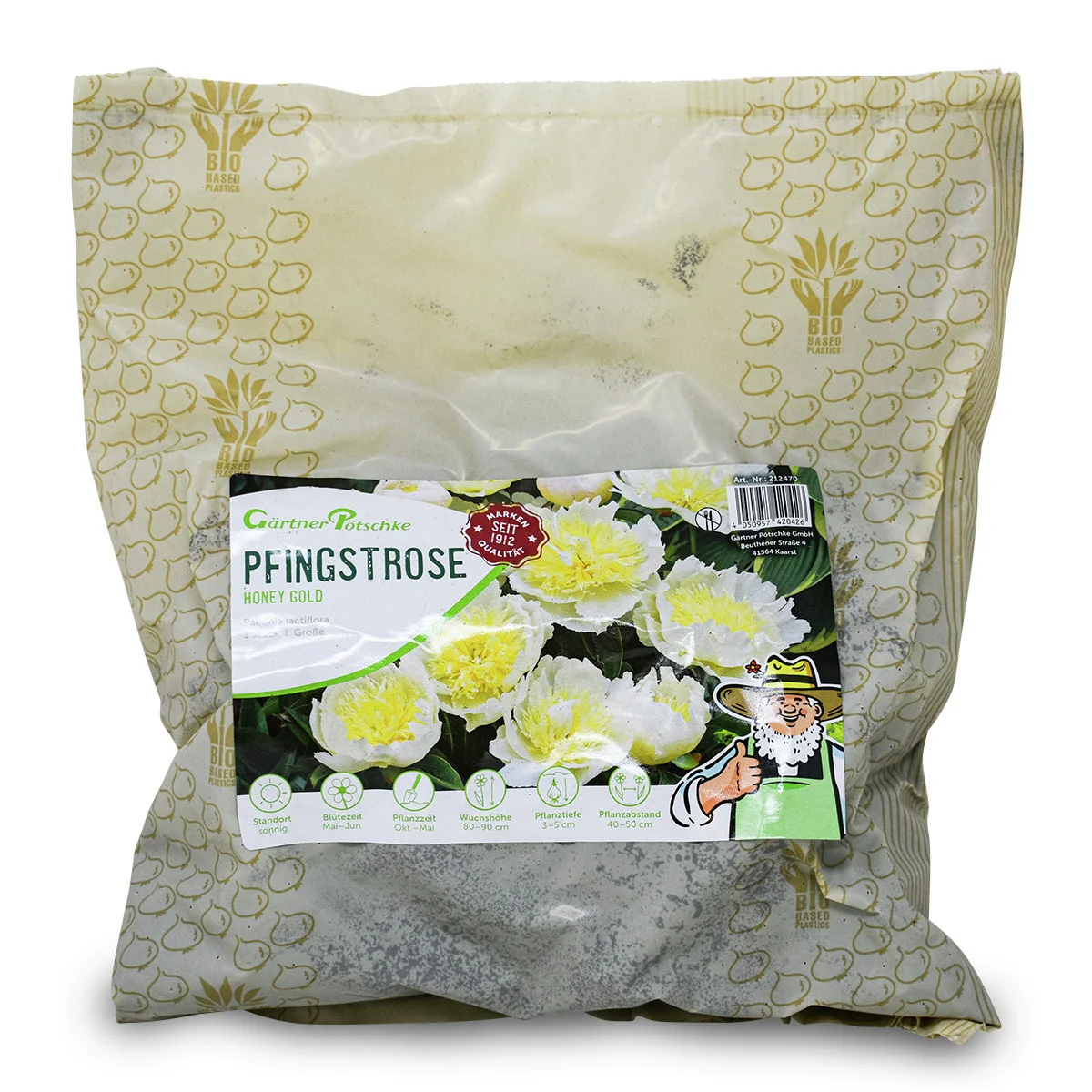 Man nehme eine weiße Blütenschale, gebe eine cremegelbe Füllung dazu – und fertig ist die edle Pfingstrose Honey Gold! Bereits seit 1966 begeistert diese langlebige Sorte Blumenliebhaber auf der ganzen Welt. Nicht zuletzt, wegen des leichten Duftes den sie verströmt. Ein Highlight für den Kübel, aber auch ein dekorativer Hingucker im Beet. Sehr schön auch in der Vase.