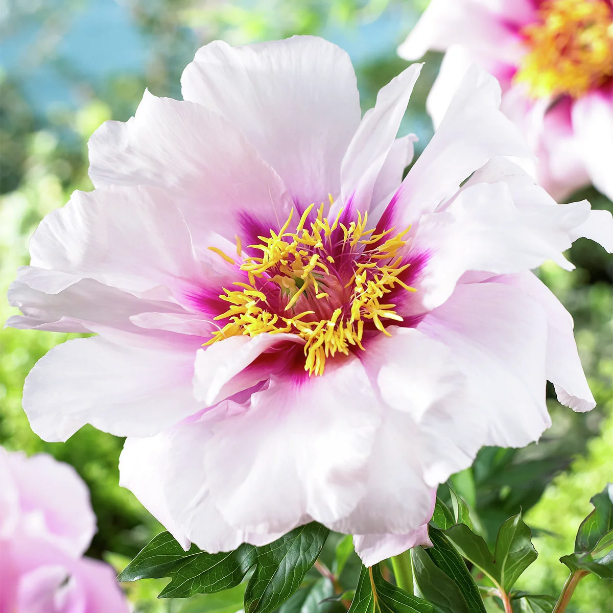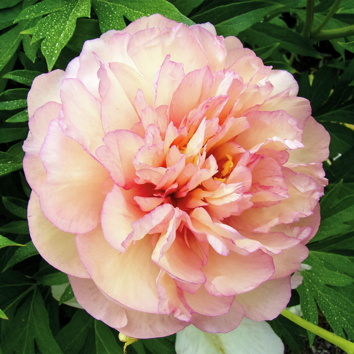 Bereits aus der Ferne leuchtet Ihnen dieses prächtige cremefarbene Blütenmeer mit rosa Umrandung entgegen und verführt Sie mit ihrem großblütigen Charme. Eine Pflanze zeigt bis zu 50 gefüllte Blüten. Bei Scrumdiddlyumptious handelt es sich um eine Itoh-Pfingstrosen-Hybride, eine Kreuzung zwischen Stauden- und Strauchpfingstrose, die sich durch besondere Langlebigkeit und Robustheit auszeichnet.