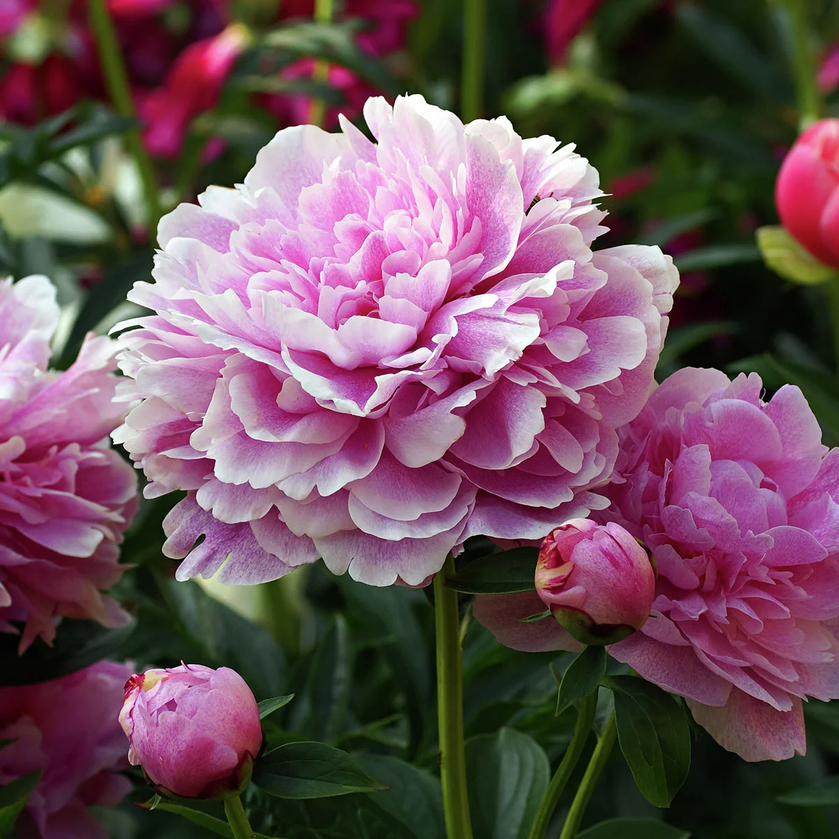 Die Pfingstrose The Fawn und verwöhnt Sie mit zahlreichen atemberaubend schönen zartrosa-rot gestreiften Blütenknospen, die auf starken, aufrechten Stielen im Beet, Kübel und auch in der Vase eine perfekte Figur machen. Schön kompakt wachsend mit stark gefüllten duftenden Blüten.