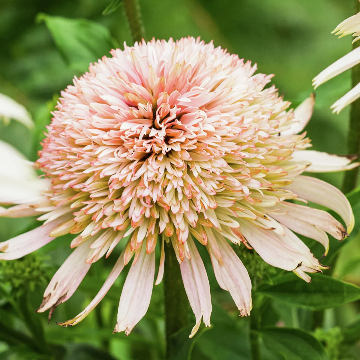 Ab Ende März bzw. Anfang April beginnt der Sonnenhut Cherry Fluff® auszutreiben. Das lanzettlich-ovale Laub steht in schönem, erfrischendem Kontrast zu dem späteren Farbverlauf der Blüten. Mit einer Wuchshöhe von 40 bis 55 cm und einer Wuchsbreite von 25 bis 35 cm gehört Cherry Fluff® zu den größeren Sommerstauden. Die mehrfarbige Schöne blüht von Juni bis September in einem fluffigen Cremeweiß mit zartgrüner Blütenmitte, die Zungenblüten zeigen sich in Zartrosa bis hin zu Cremeweiß an den Spitzen. Je weiter sich die gefüllten Blüten öffnen und je älter der Sonnenhut wird, desto mehr färben sich die Blütenblätter kirschrosa. Echinacea sind klassische Mitbewohner in Bauern- und Naturgärten oder Rabatten, ihre robuste und pflegeleichte Blütenpracht lässt sich auch als Kübelpflanzung auf der Terrasse und dem Balkon bestaunen. Dank ihrer recht stabilen, langen Stängel ist auch Cherry Fluff® für den Vasenschnitt eine ausgezeichnete Wahl. Gute Pflanzpartner im Beet sind unter anderem Rosen, Phloxe, Storchenschnabel und sämtliche Prachtstauden. Nach dem Verblühen werden die Stiele bis 15cm über dem Boden zurückgeschnitten.