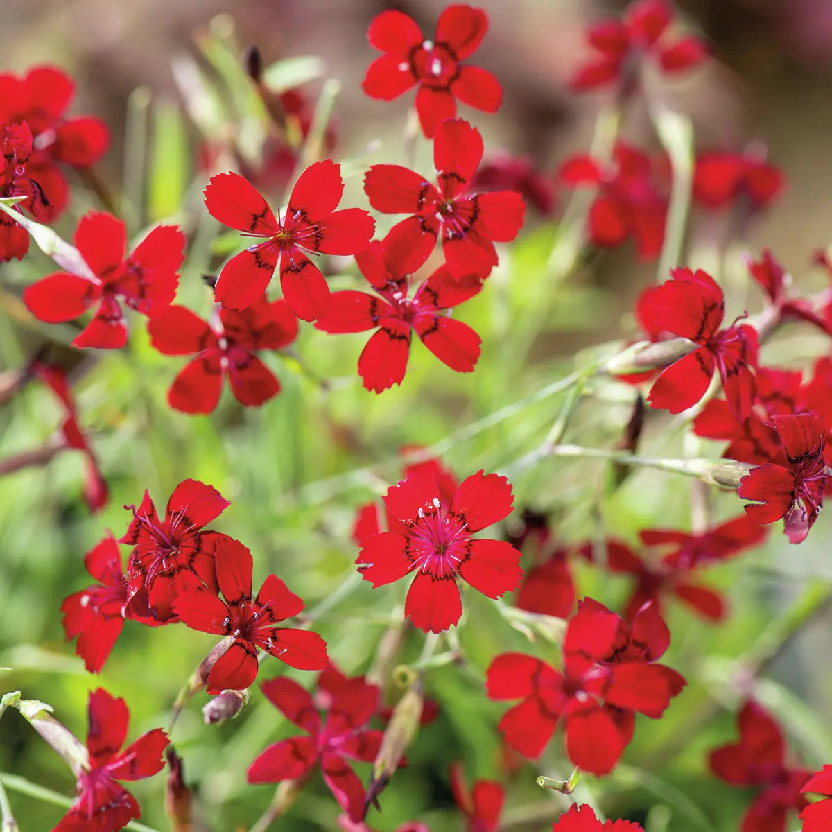 Der Gattungsname Dianthus, auf Deutsch Götterblume, weckt hohe Erwartungen an das Pflänzchen. Gerade einmal 10–15 cm wächst sie empor. Sie breitet sich lieber kompakt auf dem Boden aus, statt durch Größe auf sich aufmerksam zu machen und auch ihr schmales graugrünes Blattwerk hält sich eher im Hintergrund. Wenn sich dann aber ab Mai für mindestens drei Monate, oft noch bis in den September hinein, die vielen kleinen leuchtend roten Blüten öffnen, erntet sie schnell bewundernde Blicke. Für Begeisterung sorgt sie auch bei Schmetterlingen und Bienen, die sich vermutlich nicht nur von der intensiven Farbe und tollen Zeichnung der Blüten locken lassen, sondern auch von ihrem herrlichen, leicht süßen Duft.