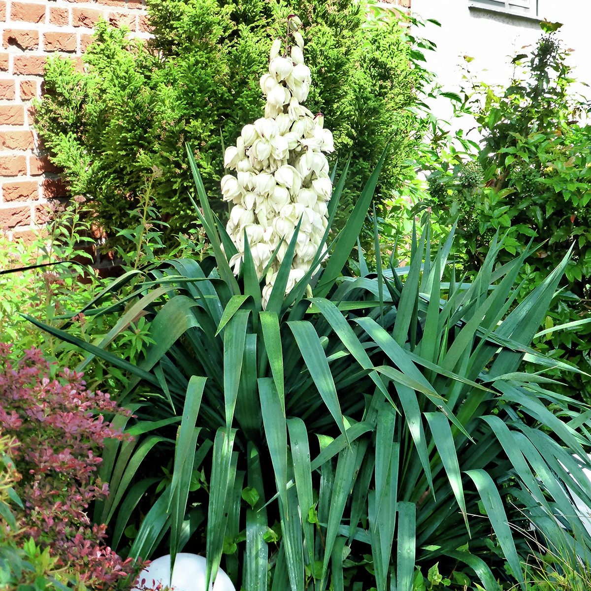 In Kombination mit dem blau-grünen Blattschopf verleiht dies der ursprünglich aus Amerika stammenden Yucca-Art eine ganz besondere Exotik.