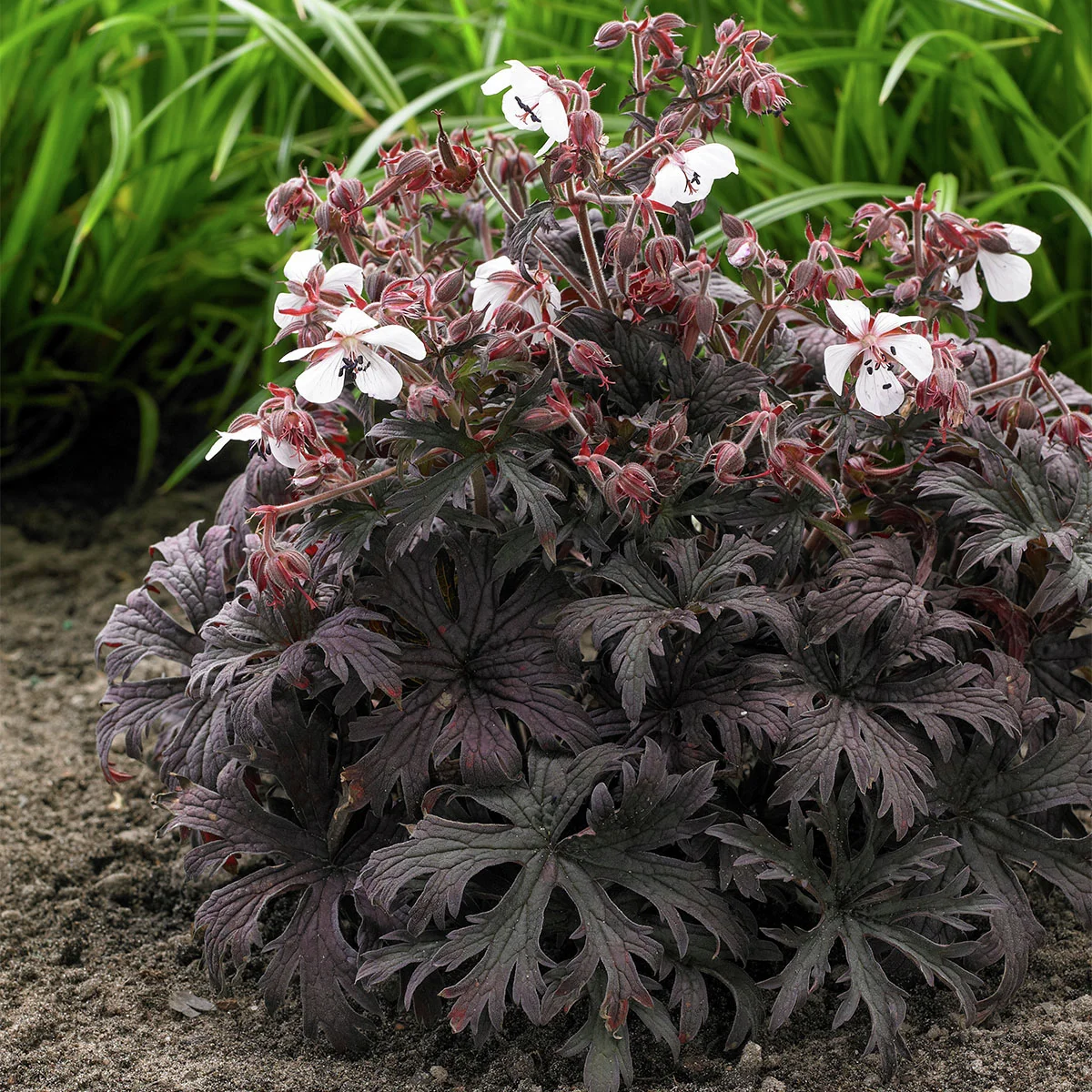 Vom Frühsommer bis zum Herbst erfreuen die weithin leuchtenden weißen Blüten des Storchschnabels Purple Ghost, der Sie zudem mit seinem dunklen, weinroten Laub zu begeistern weiß.
