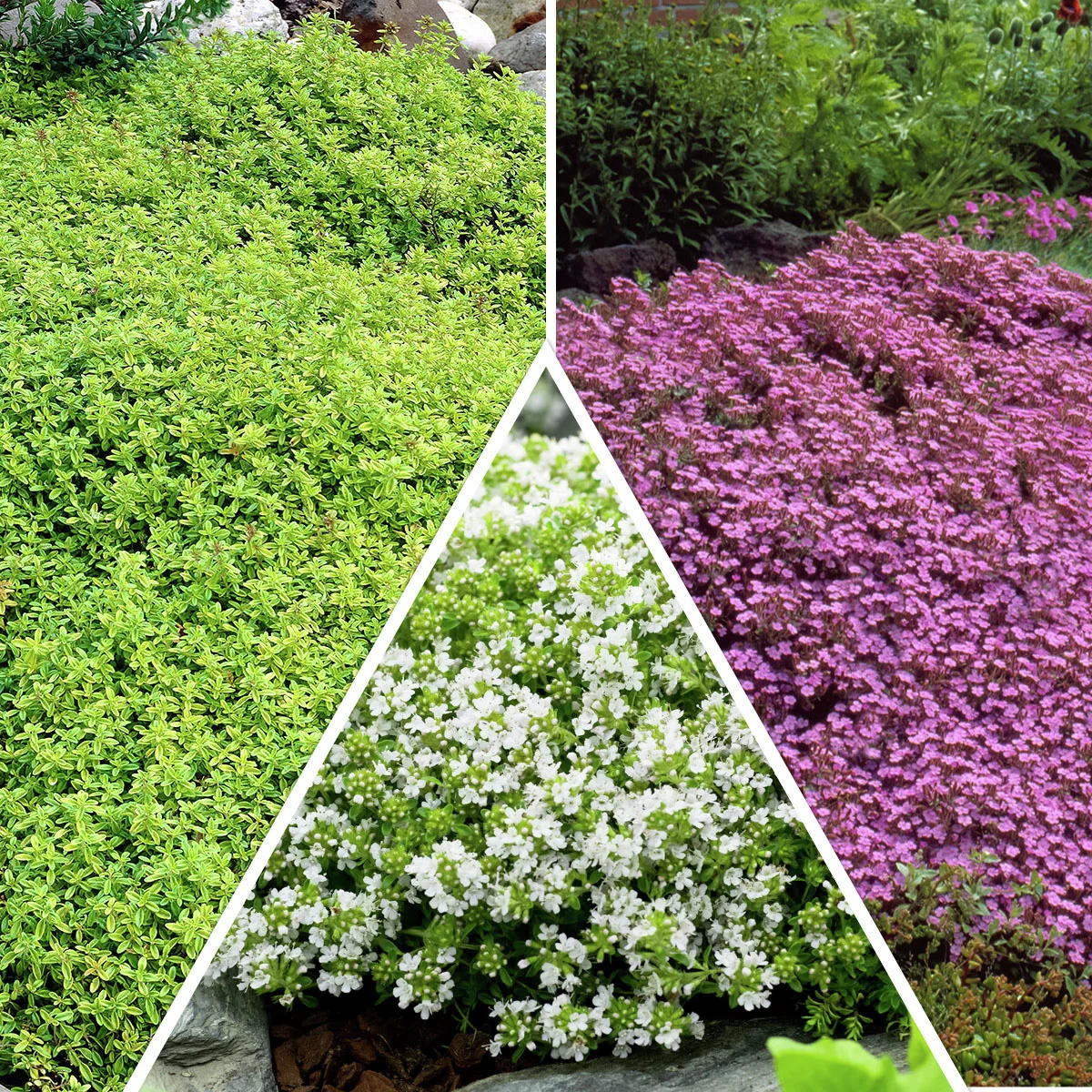 Unser Stauden-Set Thymian besteht aus drei attraktiven Sorten: Rotvioletter Thymian, Weißer Thymian und Zitronenthymian. Diese Auswahl bietet eine farbenfrohe und vielfältige Bereicherung für Ihren Garten.