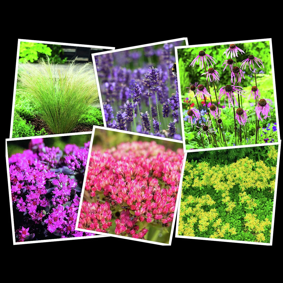 Verschiedene Fetthennen, Echter Lavendel, zartes Federgras und prächtiger Sonnenhut finden in diesem fabelhaften Trocken-Mix zusammen. Ins Beet gepflanzt ergibt sich wie von selbst ein abwechslungsreicher, in warmen Farben und unterschiedlichen Wuchshöhen wohlkomponierter Mix, der insektenfreundlich und winterhart ist und nur wenig Pflege benötigt. Perfekt geeignet für Gärten und Plätze an denen Wasserknappheit oder ein trockenes Klima eine Herausforderung darstellen. Mit ihrer außergewöhnlichen Anpassungsfähigkeit ist dieser Stauden-Mix die ideal für alle, die nachhaltige und pflegeleichte Pflanzen suchen. Lassen Sie diesen klimafetten Staudentraum wahr werden!
