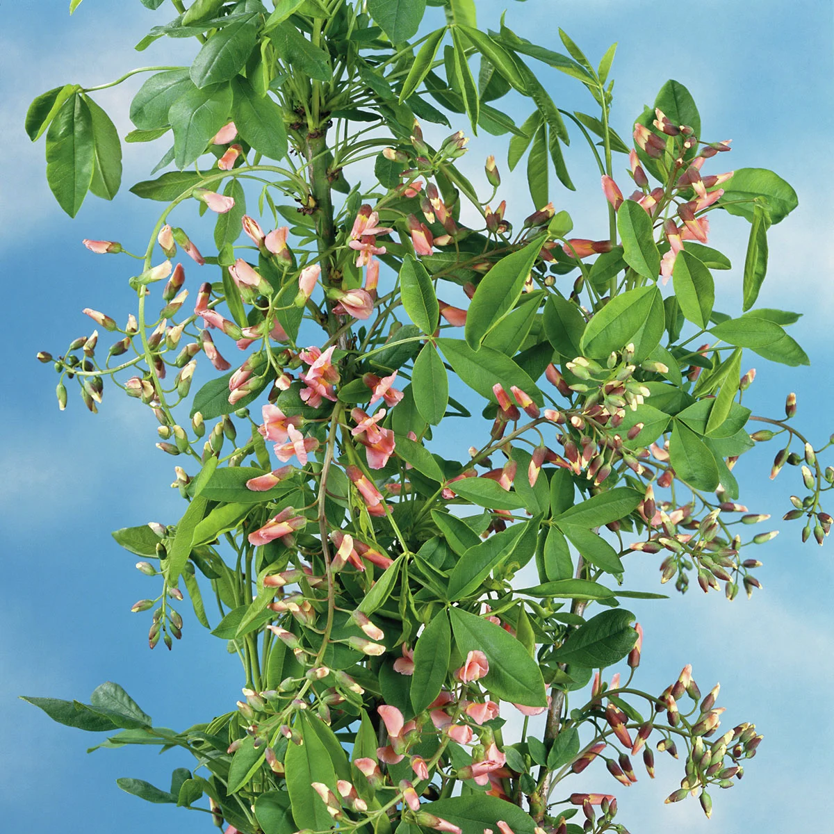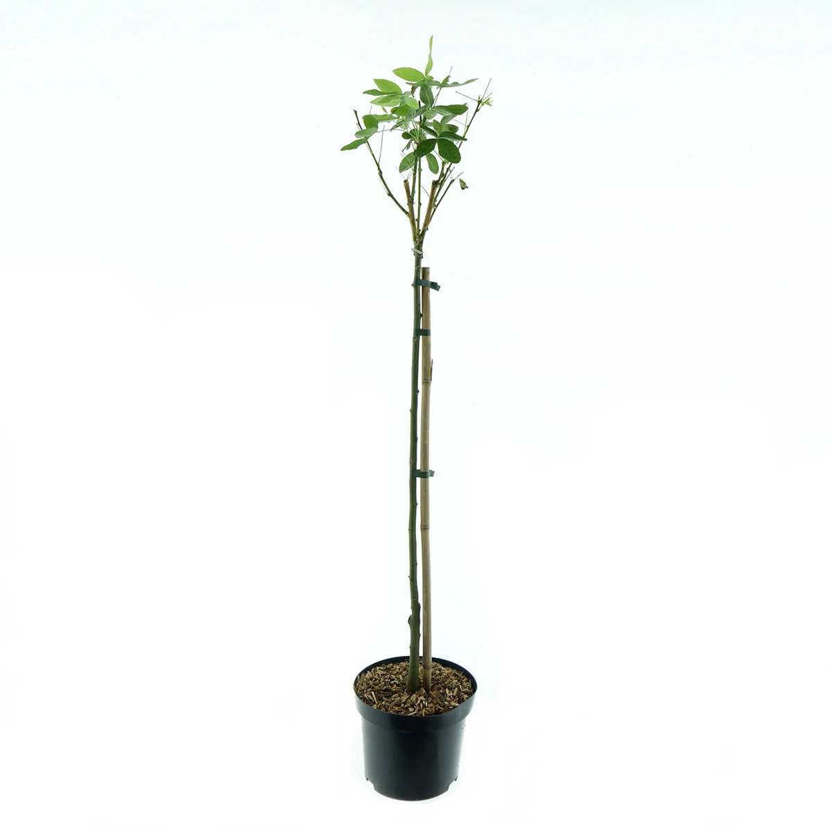 Leuchtend gelbe Goldregen-Blütentrauben, kurze purpurfarbene Ginster-Blütentrauben und pink-rosefarbene gemischte Blütentrauben tummeln sich bei diesem Zuchterfolg auf nur einem Baum. Jeder einzelne Ast präsentiert dabei jede der drei Blütenformen und -farben, was zur Blütezeit in den Monaten Mai und Juni zu einem farbenfrohen Anblick sorgt. Auch Bienen und andere Nutzinsekten wissen die Blütenvielfalt zu schätzen, die ihnen als reich gedecktes Buffet dient. Danach entwickeln sich dekorative Kapselfrüchte, die seinem Verwandten, dem Gemeinen Goldregen, den Namen Bohnenbaum eingebracht haben. Die Krone dieses Raritäten-Stämmchens wird von hellgrünen Blättern gebildet, die elliptisch und dreifach geteilt ausgesprochen dekorativ sind. Das Laub bleibt bis zum Herbst und bildet sich im Frühjahr erneut. Der Wuchs des in seiner endgültigen Größe 140–180 cm großen Bäumchens ist straff aufrecht und trichterförmig, die Äste sind leicht überhängend.