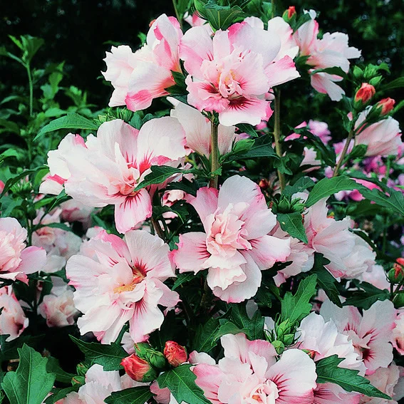 Eigenschaften: `Leopoldii´ verzaubert mit seiner tropisch anmutenden Blütenpracht. Die weiß-rosa Blüten sind stark gefüllt und erscheinen von Juli bis Oktober. Der wärmeliebende, sommergrüne Strauch hat einen kompakten, straff aufrechten Wuchs. Er wird bis zu 2,5 m hoch und im Alter 1-1,5 m breit.