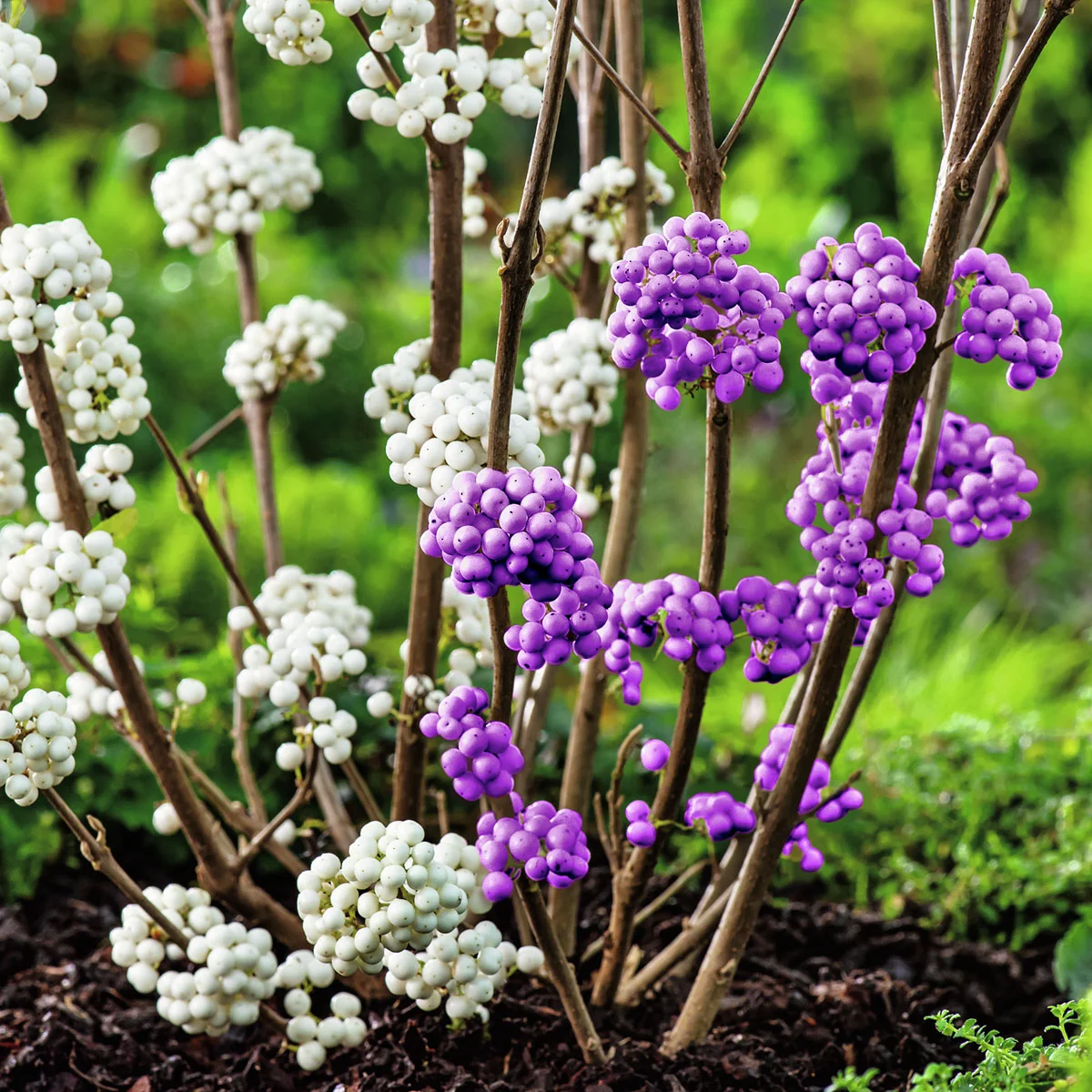 Der Liebesperlenstrauch Liebespaar präsentiert sich von Juli bis August mit hübschen weißen Blüten und einem betörenden Duft. Aber erst nach der Blüte wird die Schönfrucht ihrem Namen wirklich gerecht. Ab September bis in den Winter hinein ziert der Strauch Ihren Garten mit glänzenden Früchten in gleich zwei Farben: Weiß und Violett. Auch wenn die schönen Früchte wie zuckersüße Liebesperlen aussehen, sind sie für Menschen giftig und sollten auf keinen Fall verzehrt werden.