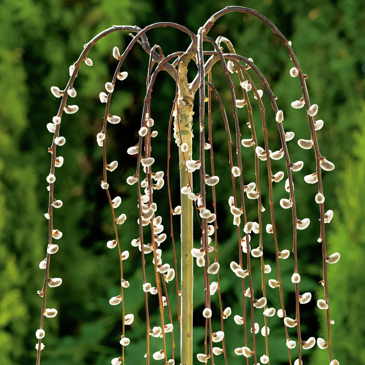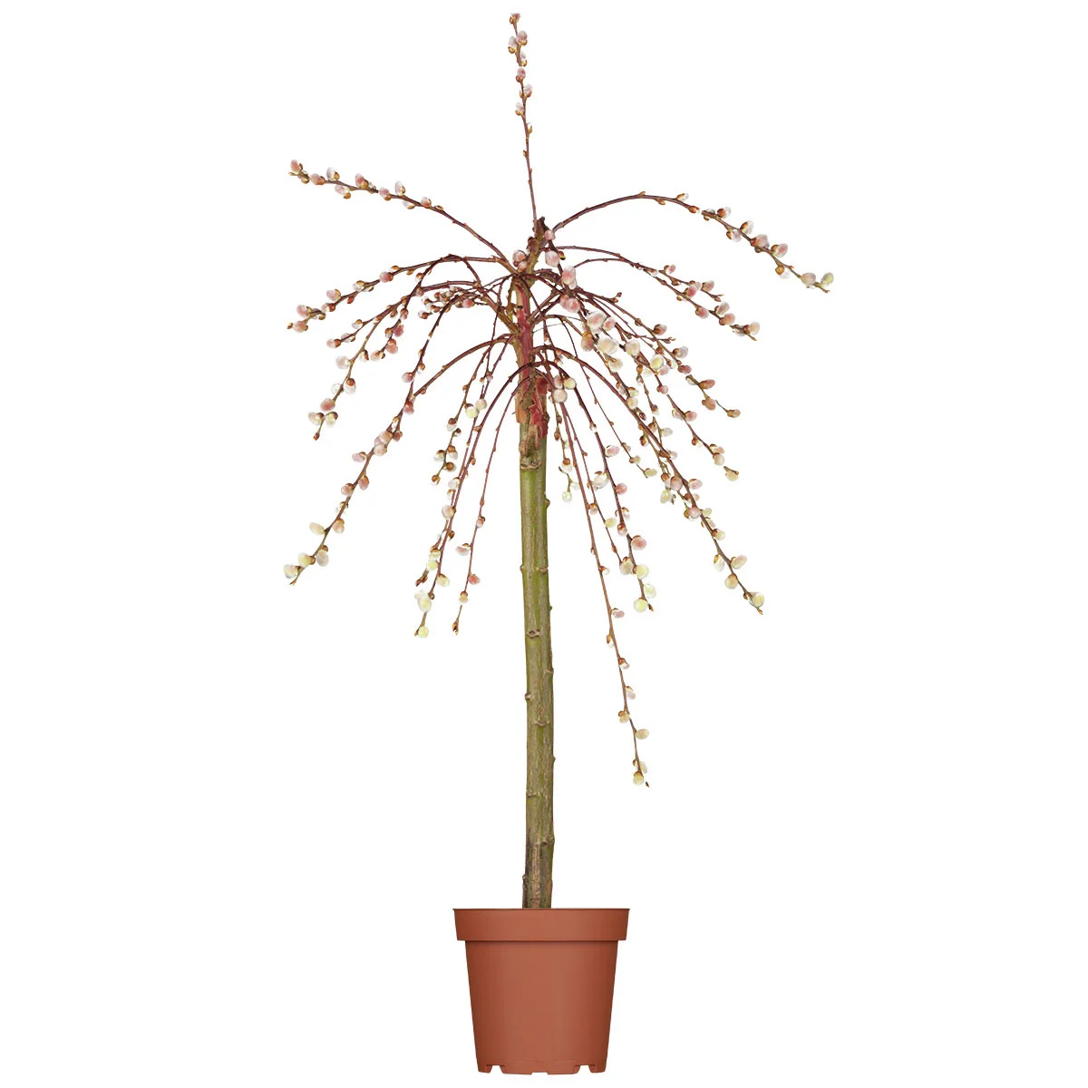 Mit seinen langen, überhängenden Trieben schmückt dieses Weidenkätzchen jeden Garten. Im Frühling verzaubert das kleinkronige Bäumchen mit vielen seidigen Kätzchen. Sie sind gelb bis silbrig und setzten so leuchtende Akzente. Auch die großen, rundlichen Blätter der Pflanze sind eine wahre Augenweide: Sie zeigen sich mattgrün, bevor sie sich im Herbst gelblich färben. Das pflegeleichte und robuste Bäumchen kommt mit allen Gartenböden gut zurecht. Suchen Sie am besten gleich ein sonniges bis halbschattiges Plätzchen für Ihr neues Weidenkätzchen aus!
