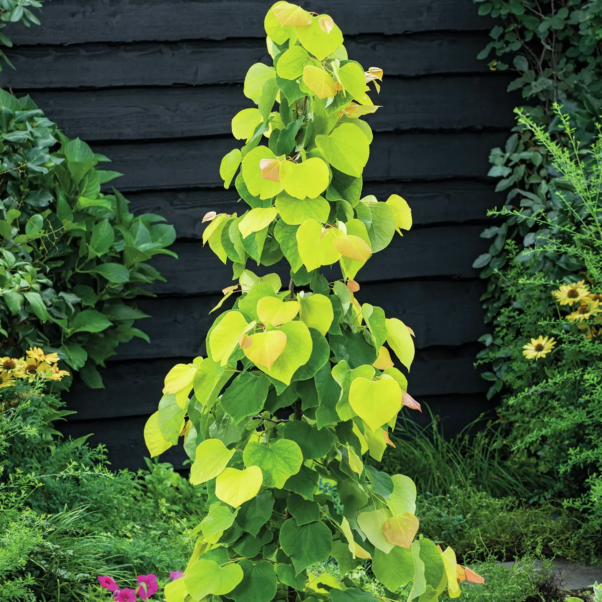 Schön, wie die aufgehende Sonne: Die zauberhaften herzförmigen Blätter von The Rising Sun treiben im Frühjahr goldgelb-orange aus, wechseln dann zu einem leuchtenden Limonengrün, nur um pünktlich zum Indian Summer zu einem warmen Gelborange zurückzukehren. Sehenswert sind auch die rosafarbenen Schmetterlingsblüten, die sich von April bis Mai an den Zweigen des mehrstammigen Ziergehölzes öffnen. Mit seinem dekorativen Wuchs und Blattwerk lässt es sich vielfältig einsetzen. Dabei ist die bienenfreundliche Rarität anspruchslos und kommt mit den verschiedensten klimatischen Bedingungen bestens zurecht.