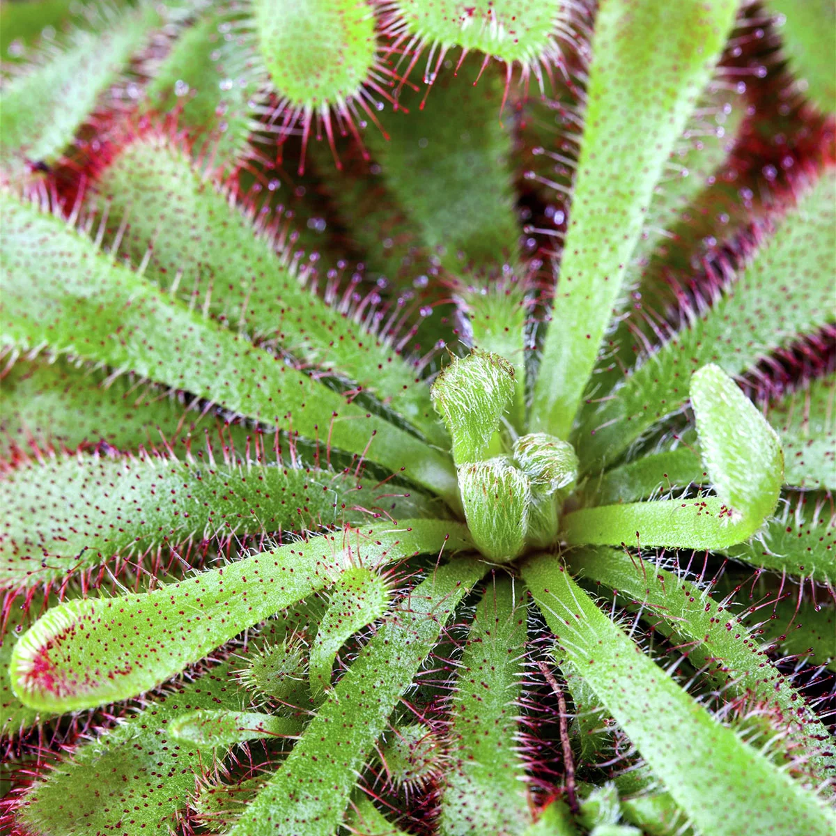 Und nicht nur Sie, sondern vor allem Fliegen gehen dem Sonnentau sprichwörtlich auf den Leim! An den zahlreichen Härchen auf seinen Blättern sitzt ein klebriges Sekret, das Insekten bei Berührung festhält. Ein Entkommen ist fast unmöglich. Weitere Klebehaare greifen nach dem Beuteinsekt und nach und nach wird es vom Blatt umschlungen.