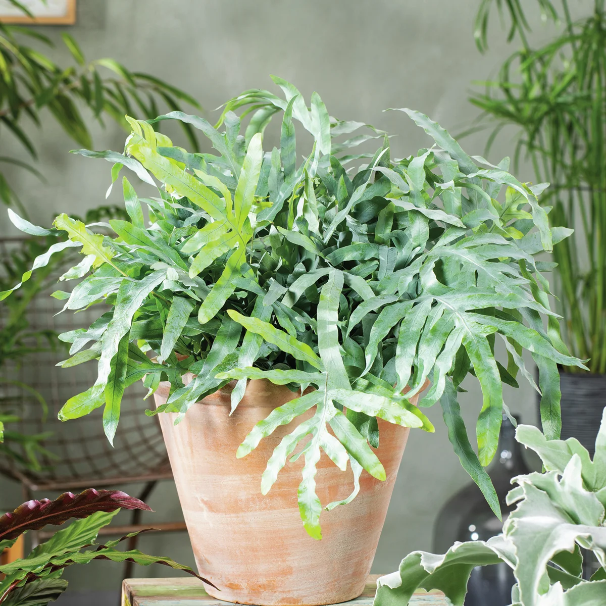Durch die in alle Richtungen wachsenden blau-grauen Blätter hat sich der Goldtüpelfarn ‚Blue Star‘ seinen Namen errungen. Dieser sternartige Farn ist ziemlich pflegeleicht. Man sollte die Blumenerde immer feucht halten, ohne dass die Pflanze im Wasser steht. Der ‚Blue Star‘ bevorzugt (halb-)schattige Plätze um am besten als Luftreiniger zu fungieren.