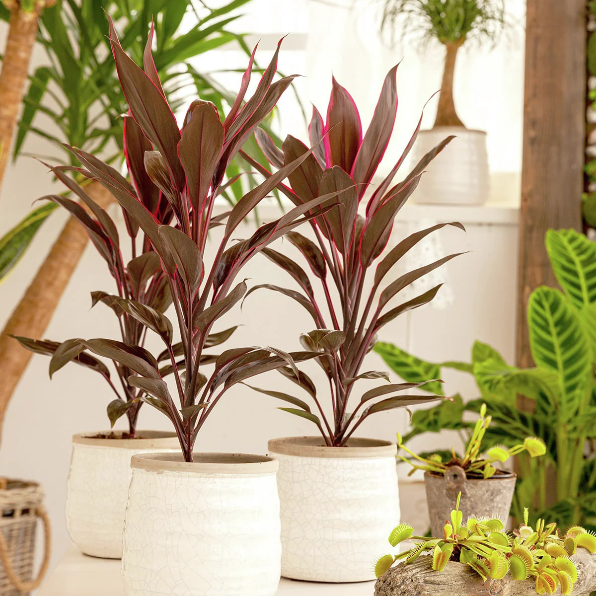 Fast sieht es so aus, als würden die eleganten grün-roten Blätter der Keulenlilie Tango tanzen, so dekorativ und aufrecht ist ihre (Blatt-)Haltung.