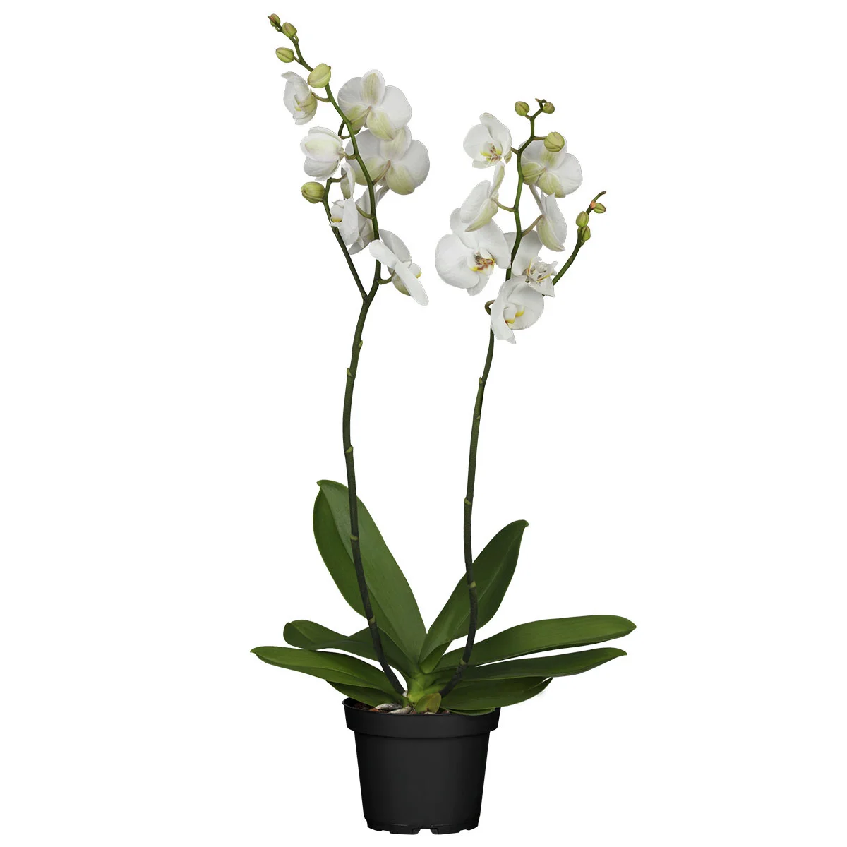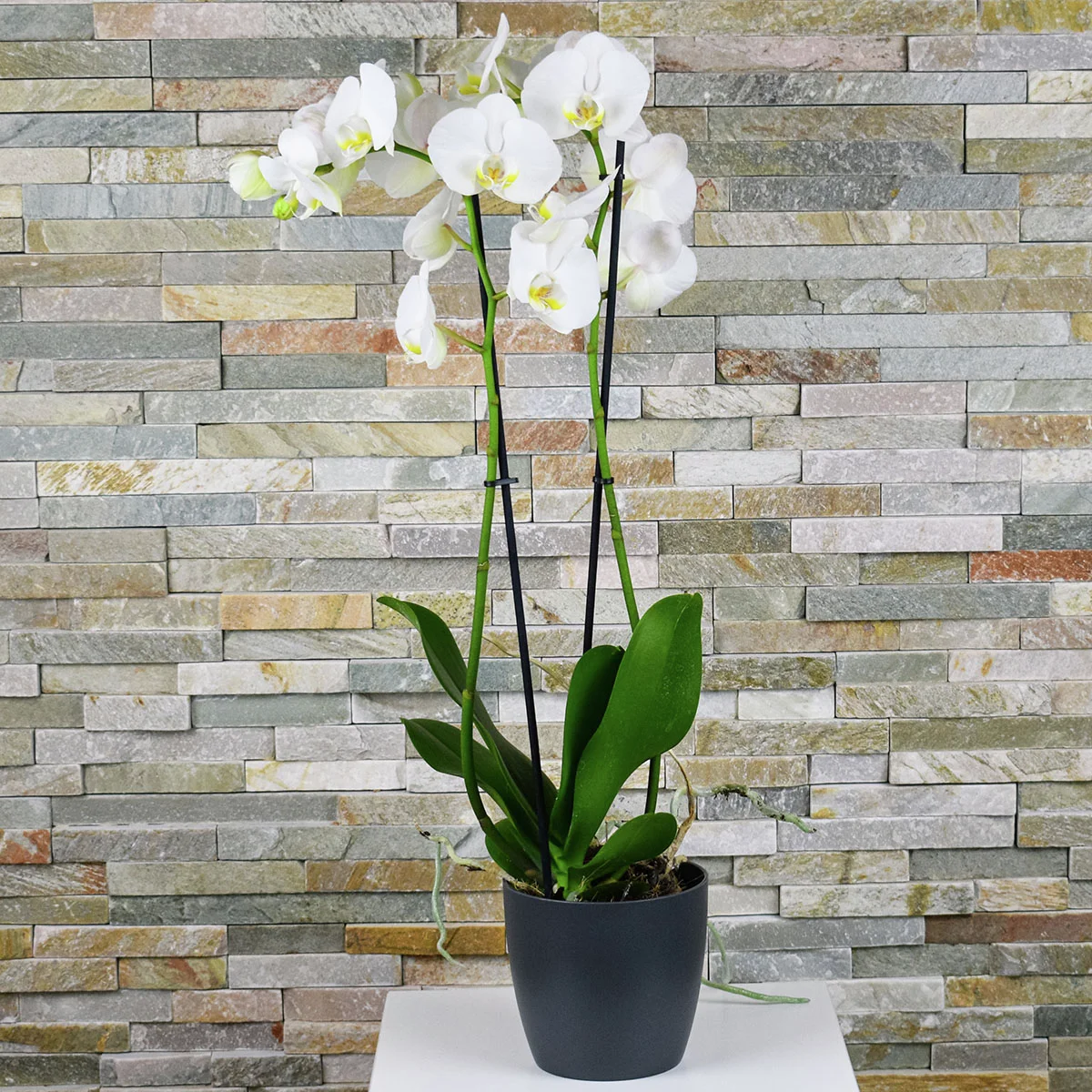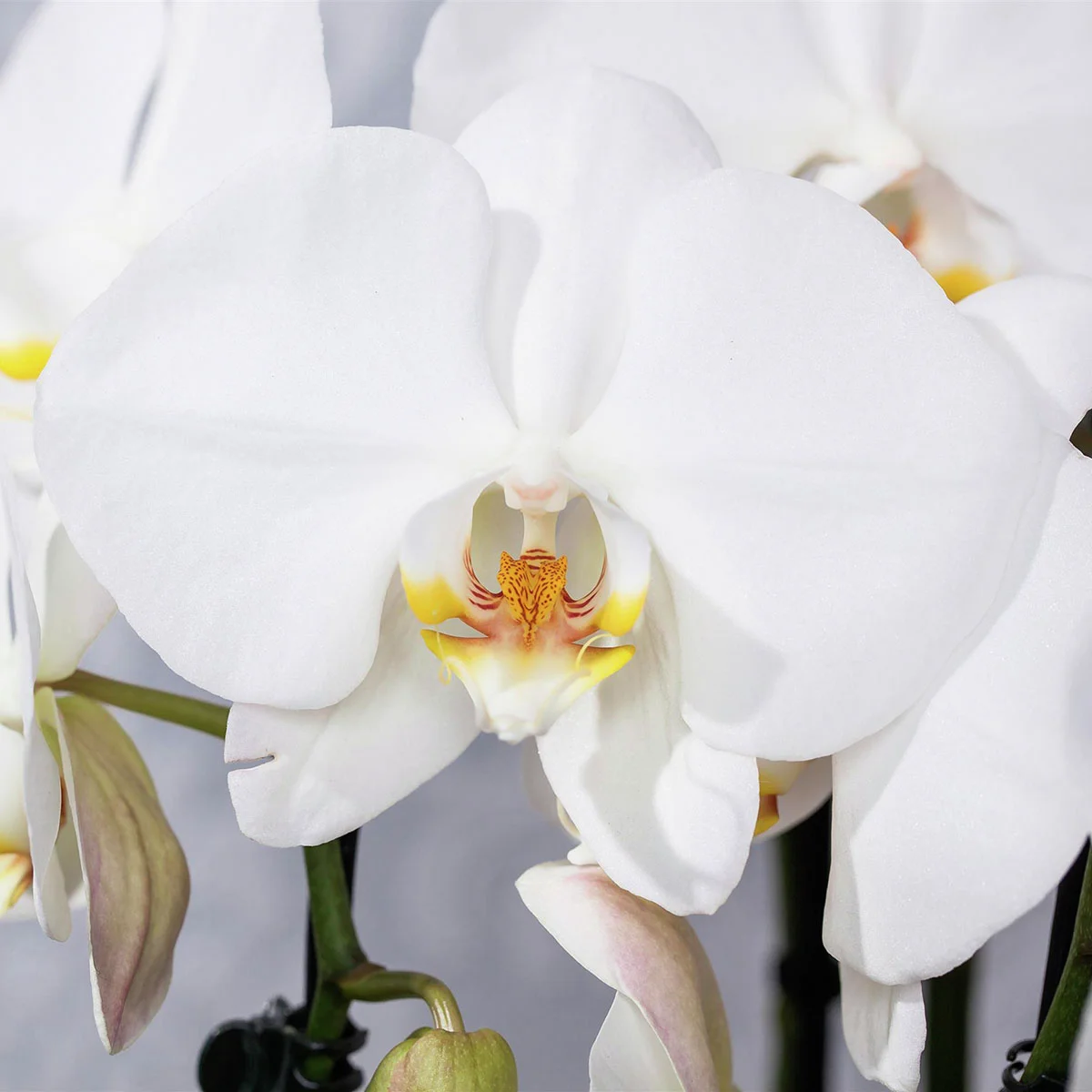Die Schmetterlings-Orchidee „Grandiflora“ betört durch Eleganz und ihre Anmut. Ihre weißen, schmetterlingsförmigen Blüten zeigen sich über mehrere Monate hinweg und schenken Ost- bzw. Westfenstern elegantes Flair.