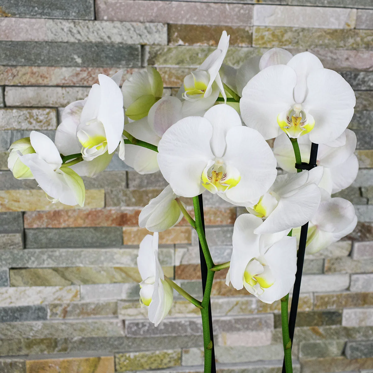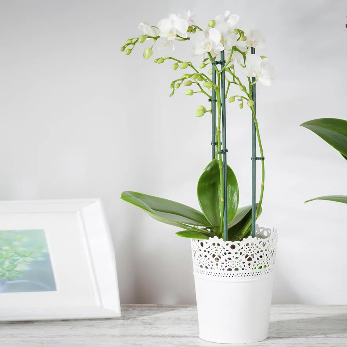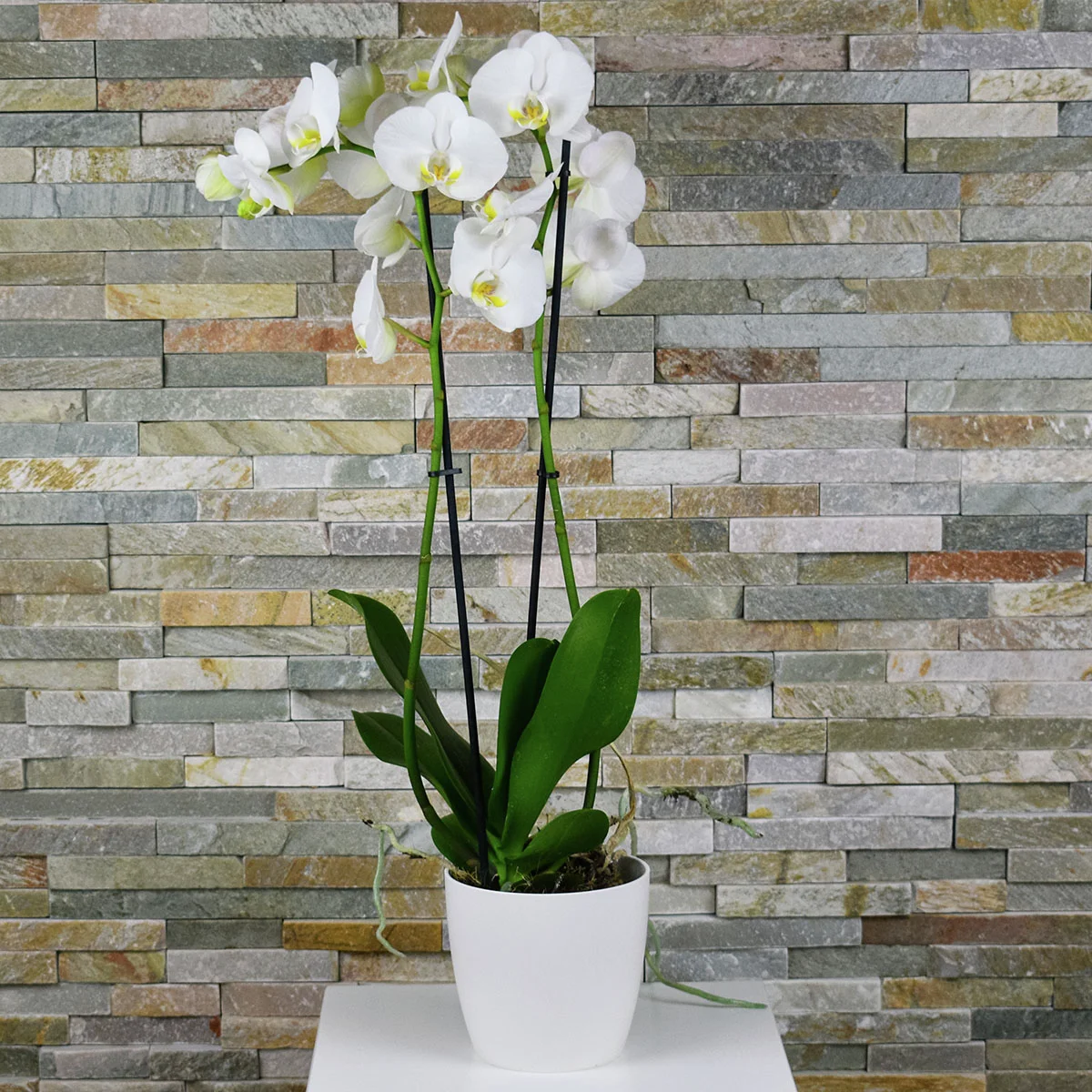 Die Schmetterlings-Orchidee „Grandiflora“ betört durch Eleganz und ihre Anmut. Ihre weißen, schmetterlingsförmigen Blüten zeigen sich über mehrere Monate hinweg und schenken Ost- bzw. Westfenstern elegantes Flair.