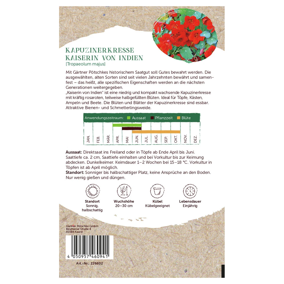 Die Kapuzinerkresse stammt ursprünglich aus Mittel- und Südamerika, hat sich aber auch in einigen wärmeren europäischen Ländern inzwischen gut etabliert. Bei uns wird sie aufgrund ihrer Kälteempfindlichkeit einjährig kultiviert. Die optimale Aussaat ist zwischen Ende April und Juni. Sie kann gerne direkt in Beet oder Kübel gesät werden, doch auch eine Vorkultur ist möglich. Die etwa erbsengroßen Samen des Dunkelkeimers werden etwa 2 cm mit Erde bedeckt und benötigen dann bei 15–18 °C etwa 1–2 Wochen bis zur Keimung. Vorgezogene Pflänzchen sollten zwischen Mai und Juni ausgepflanzt werden.