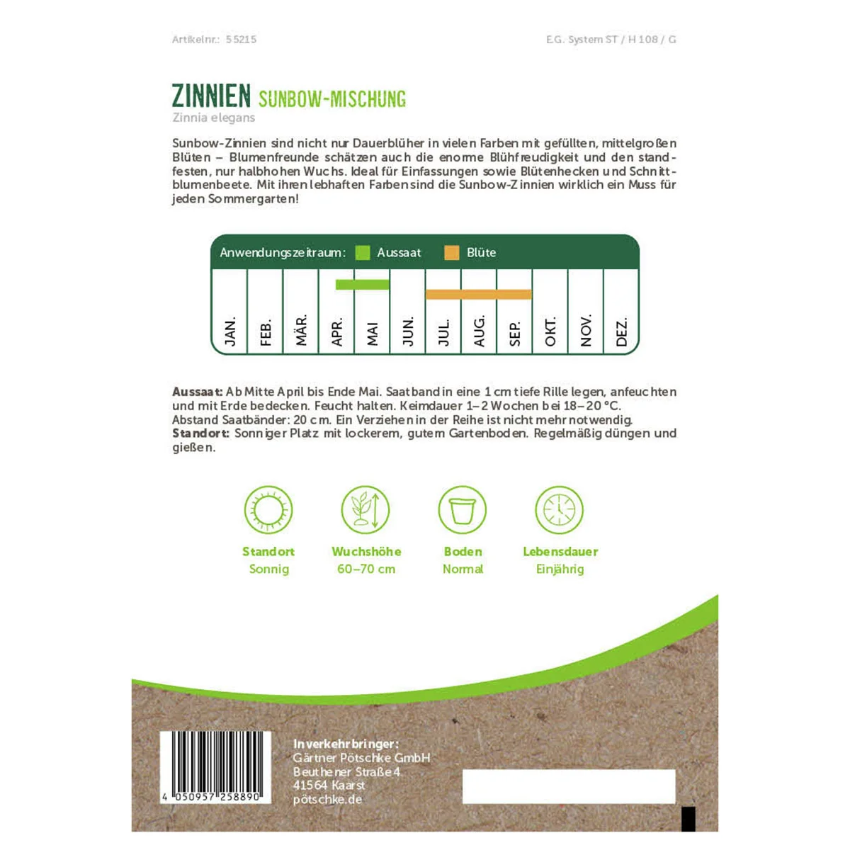 Tipp: Sunbow-Zinnien sind Dauerblüher in vielen Farben mit gefüllten, mittelgroßen Blüten. Ein halbhoher, standfester und enorm reichblühender Dauerblüher für sonnige Beete, Blüten-Hecken und Schnittblumenbeete. Höhe 60–70 cm, einjährig.