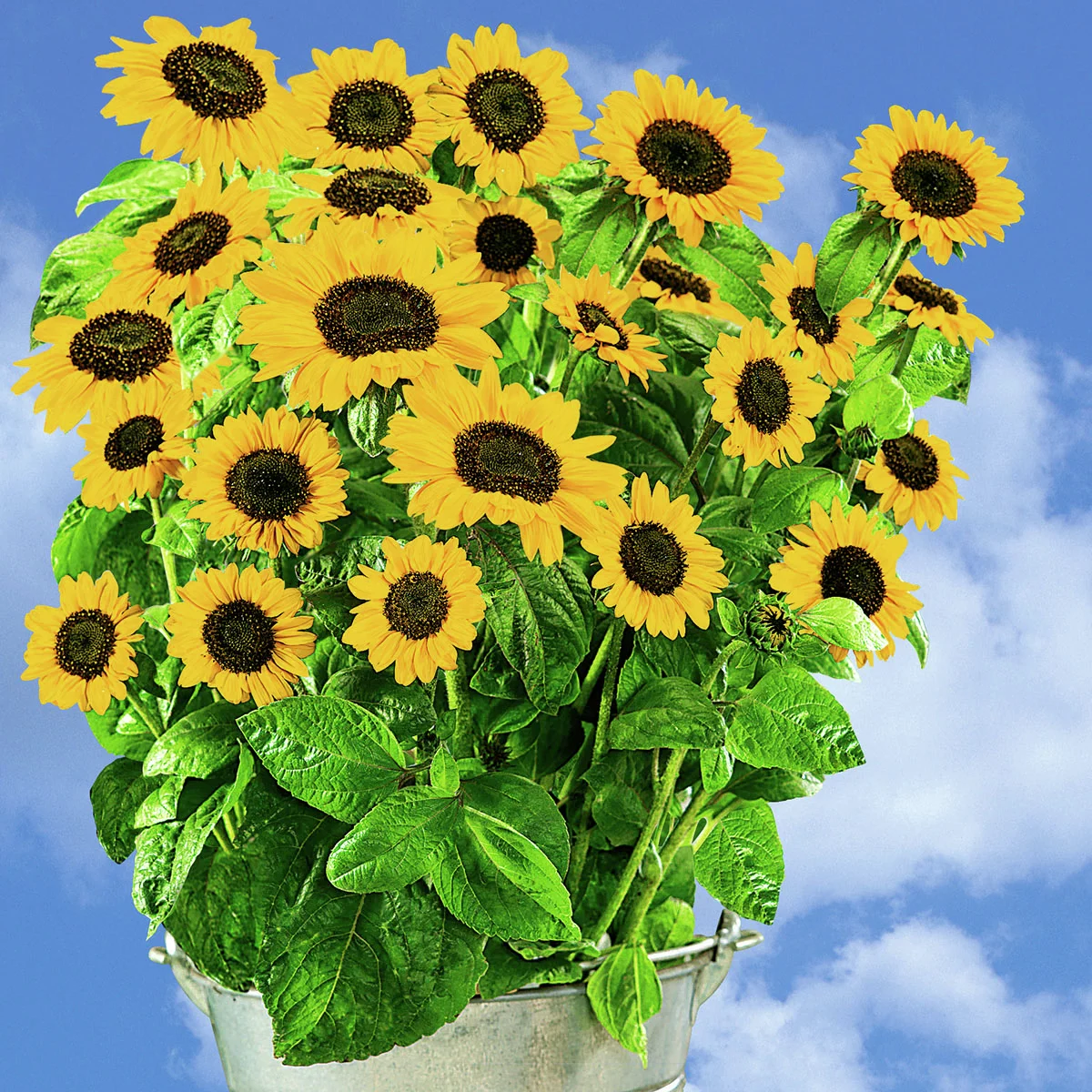 Sehr früh erscheinen die nur etwa 10 cm großen, gold-orangen Blüten dieses Sonnenblumentyps. Dank ihrer stets blühenden Seitentriebe eine hervorragende Beet- und Schnittsorte.