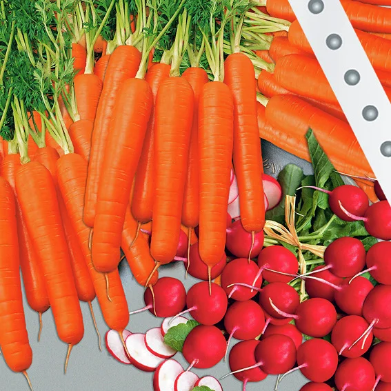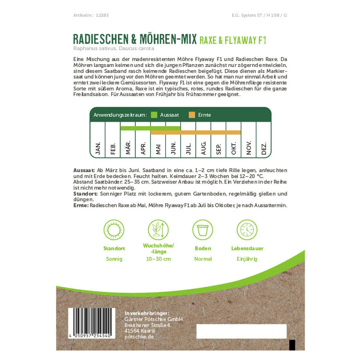 Tipp: Da Möhren langsam keimen und sich die jungen Pflanzen zunächst nur zögernd entwickeln, sind diesem Saatband rasch keimende Radies beigefügt. Diese dienen als Markiersaat und können jung vor den Möhren geerntet werden. So hat man nur einmal Arbeit und erntet zwei leckere Gemüsesorten. Flyaway F1 ist eine gegen die Möhrenfliege resistente Sorte mit süßem Aroma, Raxe ist ein typisches, rotes, rundes Radieschen für die ganze Freilandsaison. Für Aussaaten von Frühjahr bis Frühsommer geeignet.