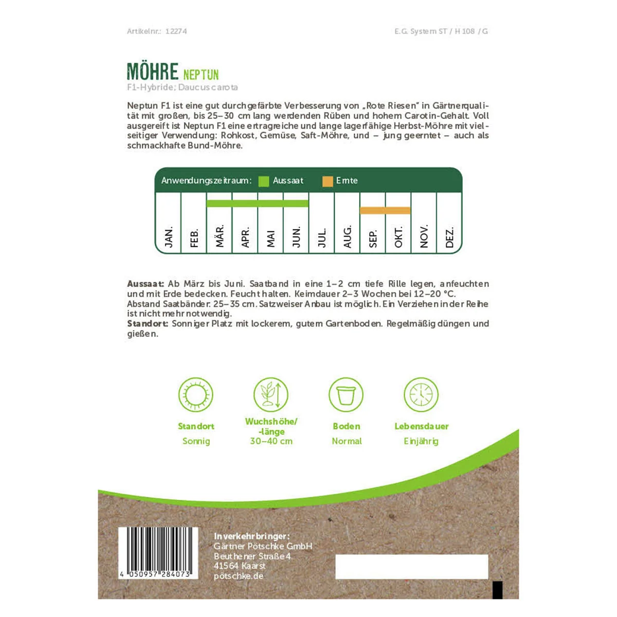 Tipp: Gut durchgefärbte Verbesserung von „Rote Riesen“ in Gärtnerqualität mit großen, bis 25 cm lang werdenden Rüben und hohem Carotin-Gehalt. Voll ausgereift ist Neptun F1 eine ertragreiche und lange lagerfähige Herbst-Möhre mit vielseitiger Verwendung: Rohkost, Gemüse, Saft-Möhre, und – jung geerntet – auch als schmackhafte Bund-Möhre.