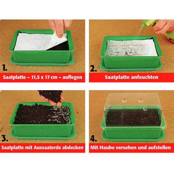 Meine Saatplatten sind ideal zur Anzucht leckerer Gemüsesorten in Aussaatschalen oder Mini-Gewächshäusern auf der Fensterbank. Am einfachsten klappt dies mit meiner genau auf die Größe der Saatplatten abgestimmten Saatbox. Einfach die Saatbox mit Aussaaterde füllen, die Saatplatte darin auslegen, angießen und dünn mit Erde abdecken – fertig.