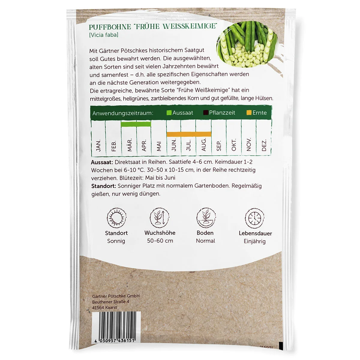 Die Pflanzen sind sehr standfest, gesund und robust. Geerntet werden Puffbohnen, wenn die Körner ausgereift, aber noch leicht weich und milchig sind. Am besten frisch verwenden, Konservierung ist durch Trocknen oder Einfrieren möglich.