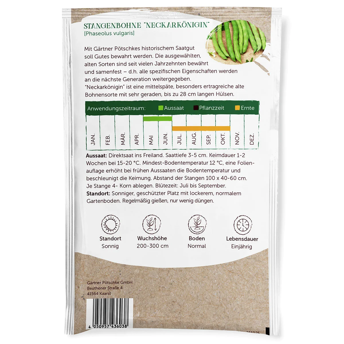 Neckarkönigin ist eine mittelspäte, besonders ertragreiche alte Bohnensorte mit sehr geraden, bis zu 28 cm langen Hülsen. Sie ist robust und resistent gegen das Bohnenmosaikvirus und daher auch sehr gut für den Freilandanbau geeignet.