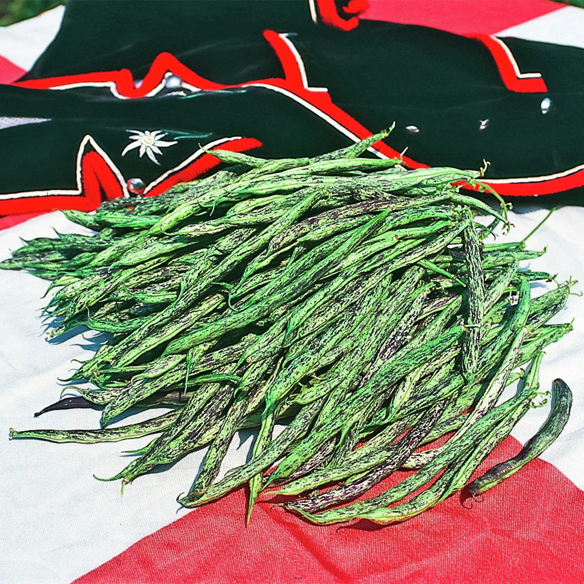 Tipp: Eine Verbesserung von „Berner Landfrauen“ mit grün-violett gesprenkelten, runden und fleischigen Hülsen ohne Fäden. Diese werden ca. 20–22 cm lang und haben einen unvergleichlichen Bohnengeschmack. Resistent gegen Brennflecken und Bohnenmosaikvirus.
