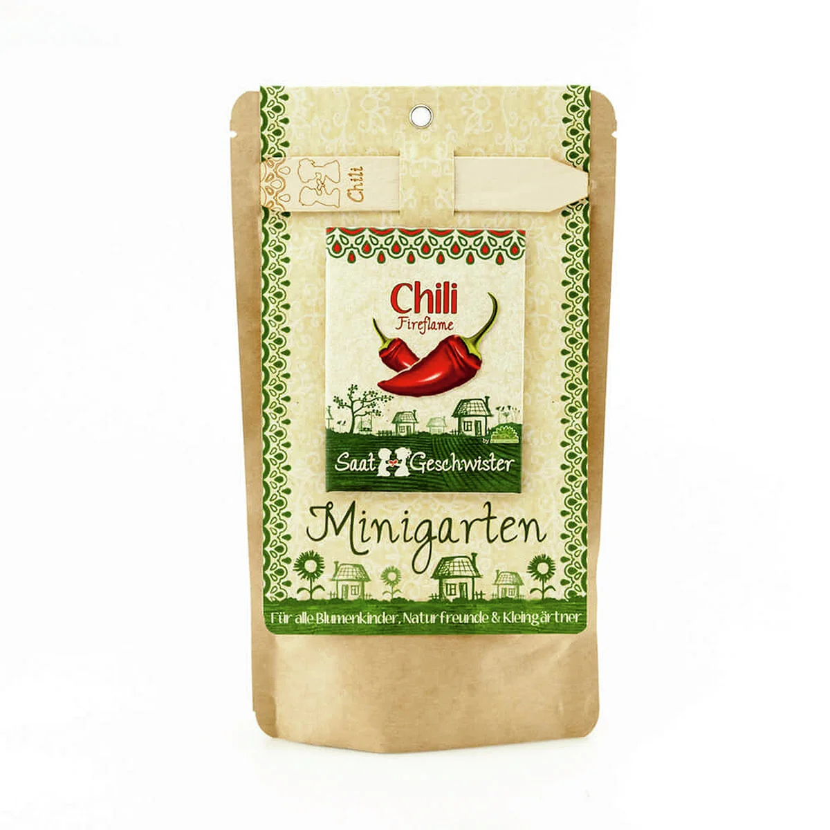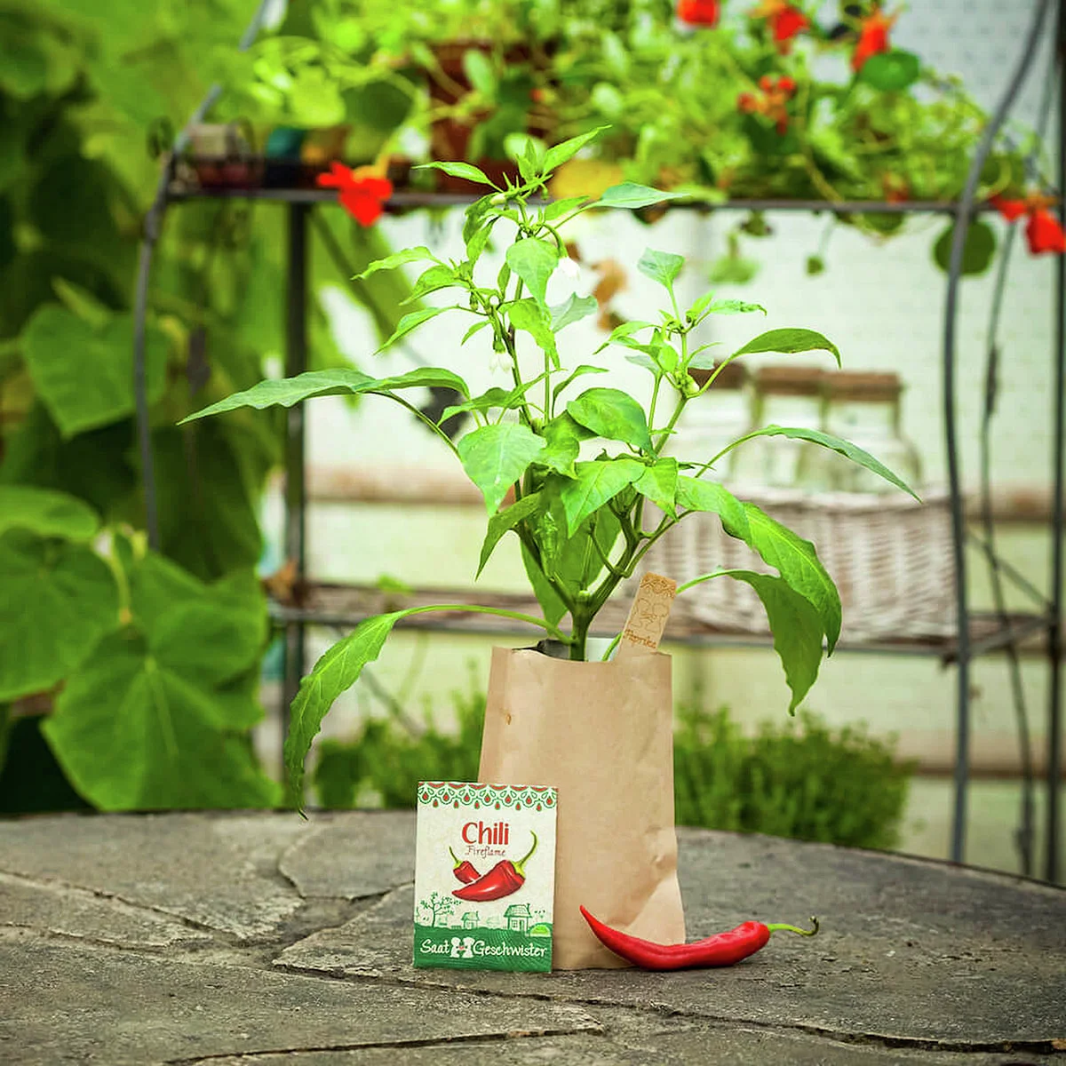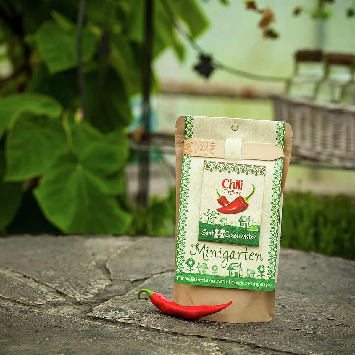 Der Minigarten enthält Erde, hochwertiges Chili-Saatgut und ein passendes Pflanzstäbchen. Verpackt in eine wasserfeste Tüte als Pflanz- oder Anzuchttopf.