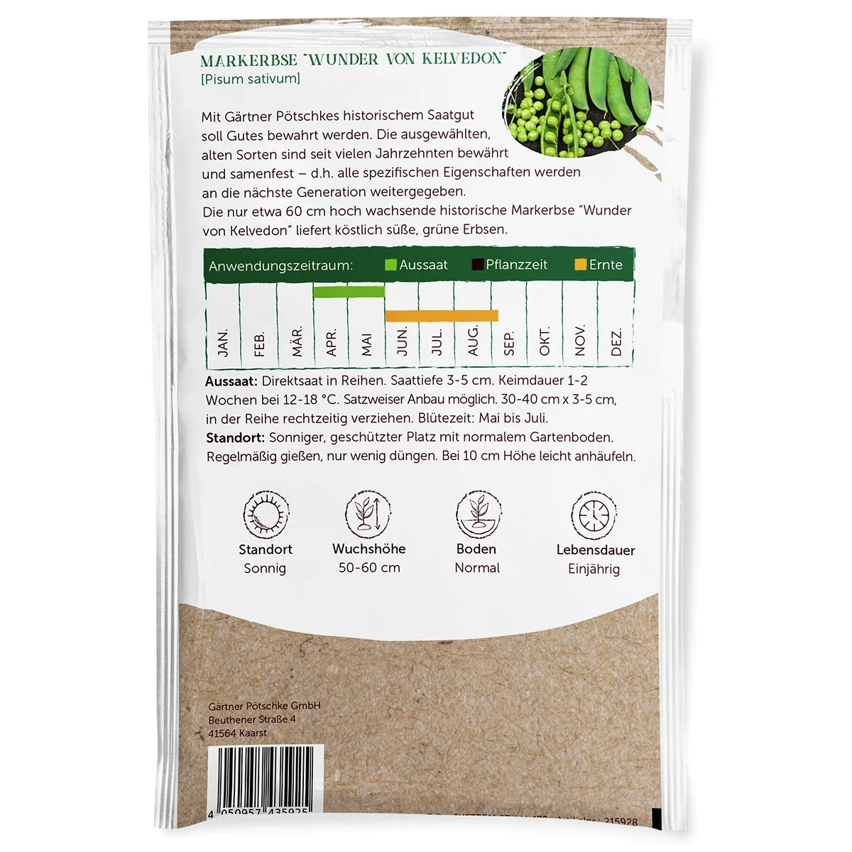 Die nur etwa 60 cm hoch wachsende historische Markerbse Wunder von Kelvedon bildet lange Hülsen und liefert köstliche süße, grüne Erbsen. Sehr gut zum Einwecken und Tiefgefrieren geeignet. Robuste und sehr ertragreiche Sorte. Mehrfache Ernten möglich.