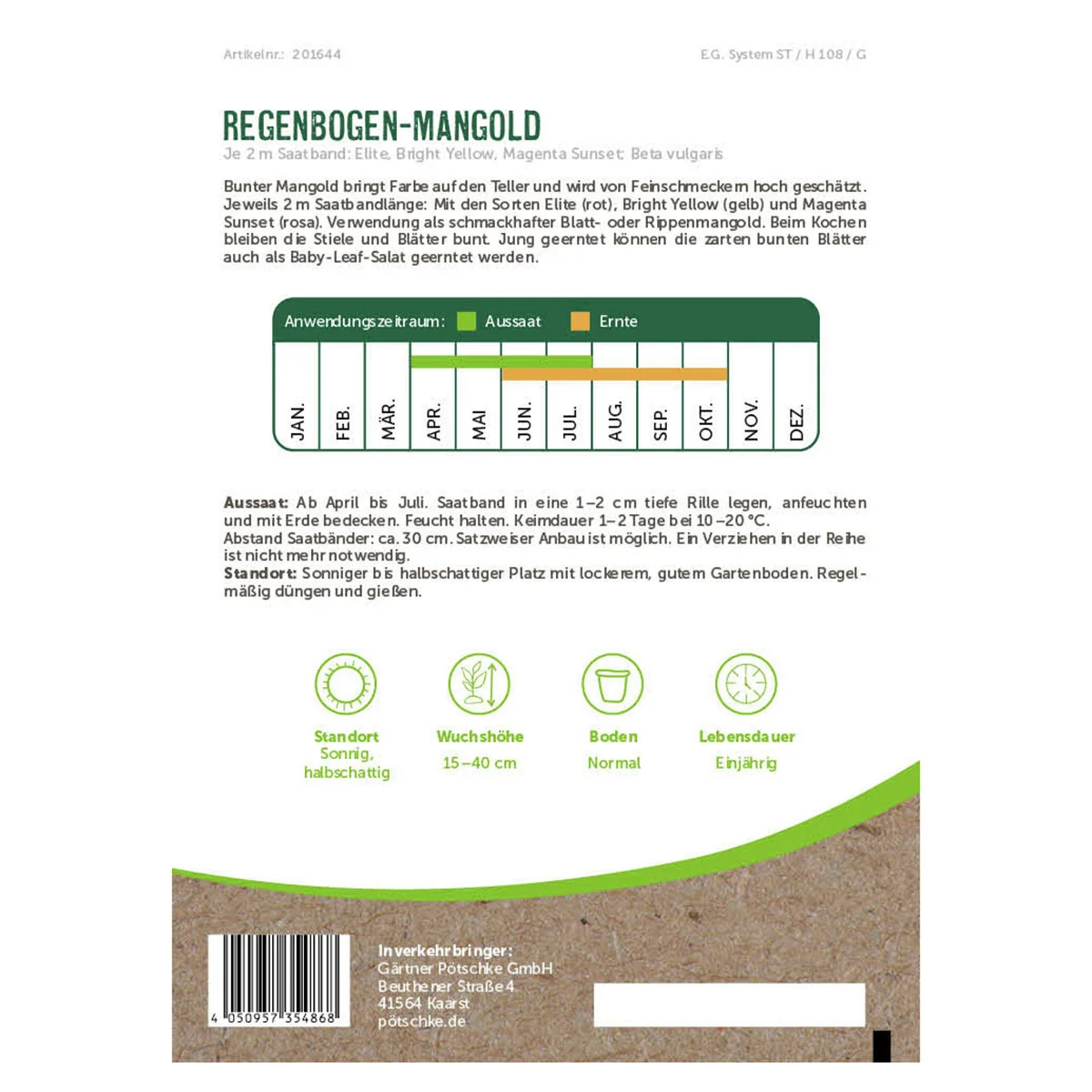 Aussaat: Ab April bis Juli. Saatbeet glätten und im Abstand von 30 cm flache, 1–2 cm tiefe Rillen ziehen, Saatband darin auslegen. Anschließend gut angießen und das Saatband mit feinkrümeliger Erde oder besser Aussaaterde abdecken und durch Andrücken für guten Bodenschluss sorgen. Saatband anschließend nochmals angießen und dann gleichmäßig feucht halten. Satzweiser Anbau ist möglich. Ein Verziehen in der Reihe ist nicht mehr notwendig, da das Mangold-Saatgut schon im optimalen Abstand aufgebracht ist. Keimdauer 1–2 Tage bei 10-20 °C.