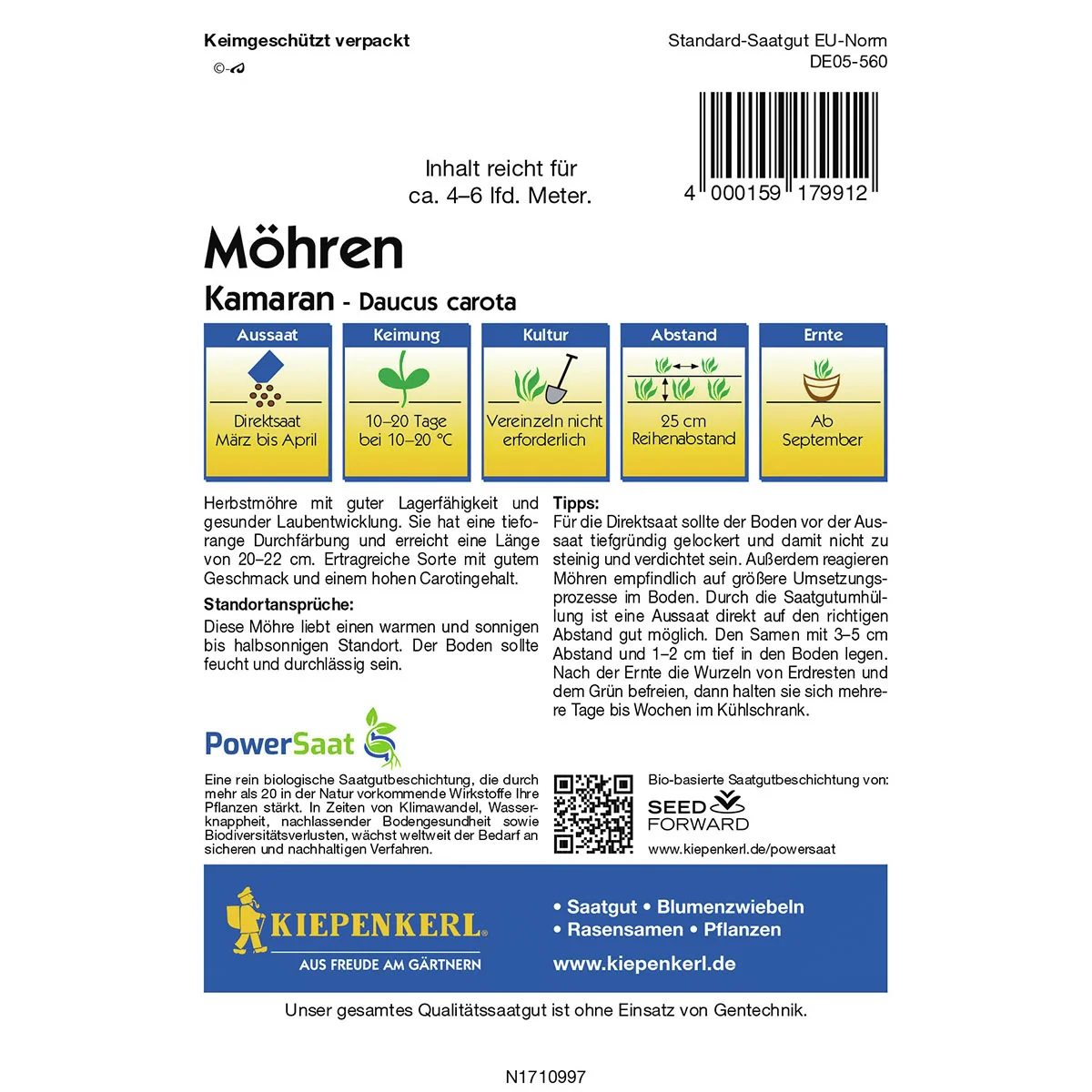 Die Möhre Kamaran liebt einen warmen und sonnigen bis halbsonnigen Standort mit lockerem, feuchtem Boden. Die Direktsaat erfolgt in Reihen von März bis April, wenn die Temperaturen zwischen 10 und 20 Grad liegen. Das Saatgut mit 3 bis 5 cm Abstand und einer Pflanztiefe von 1 bis 2 cm in den tiefgründig gelockerten Boden legen. Der Abstand zwischen den Reihen sollte etwa 25 cm betragen, ein Vereinzeln ist bei dieser Sorte nicht notwendig. Der Inhalt einer Portion reicht für ca. 4 bis 6 laufende Meter. Für optimales Wachstum sollten die Möhren stets gut gewässert werden, insbesondere in Trockenperioden.