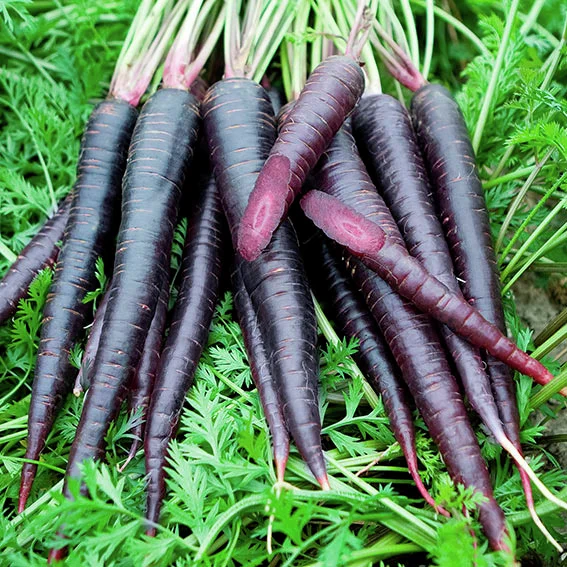 Tipp: Purple Sun F1 ist die erste violettblaue Möhre mit kompletter violetter Durchfärbung. Die leicht konischen Rüben sind bereits früh gut gefärbt und können schon als Bund- oder Fingermöhre oder voll ausgereift als Herbstmöhre geerntet werden. Dank hohem Zuckergehalt sehr schmackhaft. Zusätzlich enthält sie sehr viel Anthocyan, das sich günstig auf die Blutgefäße auswirkt.