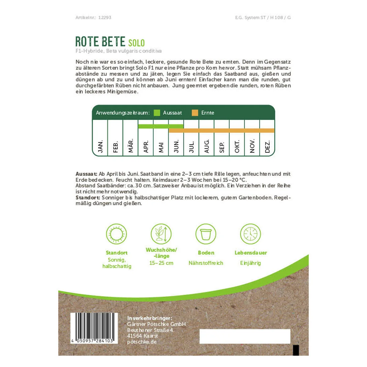 Keimdauer 2–3 Wochen bei 15–20 °C. Ein Verziehen in der Reihe ist nicht mehr notwendig, da das Rote Bete-Saatgut schon im optimalen Abstand aufgebracht ist. Satzweiser Anbau ist möglich.