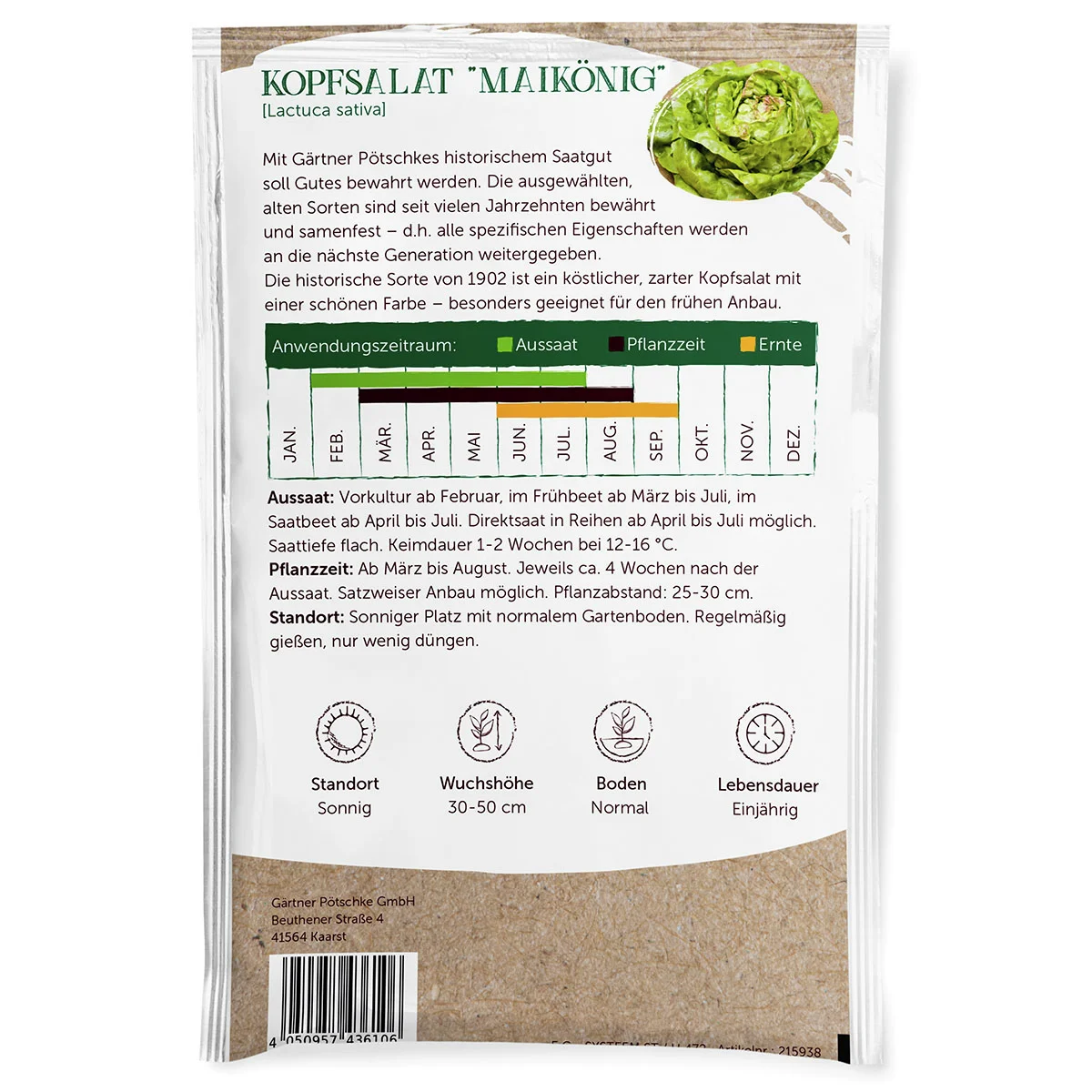 Die historische Sorte Maikönig von 1902 ist ein köstlicher, zarter Kopfsalat mit einer schönen grünen Farbe – besonders geeignet für den frühen Anbau im Frühbeet oder Gewächshaus. Die Köpfe sind mittelgroß, schnellwüchsig und bieten eine lange Ernteperiode. Am besten geeignet für den Frühsommer- und Herbstanbau.