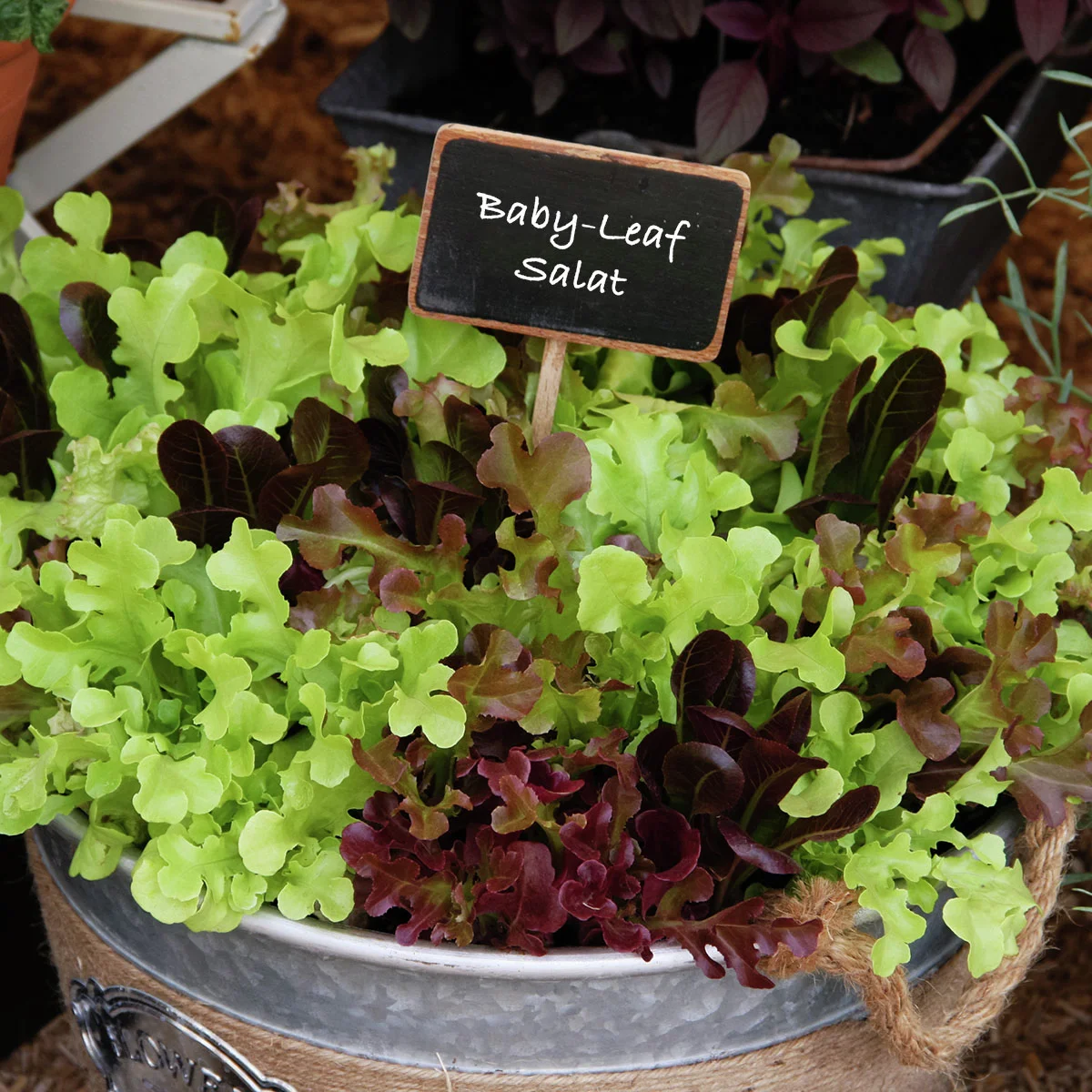 Tipp: Beim Baby-Leaf-Salat werden verschiedene bunte Pflücksalat-Sorten dicht ausgesät und bereits nach ca. 30 Tagen beginnt die Ernte der jungen, zarten Blätter. Wenn man die Blättchen ca. 1 cm über dem Boden vorsichtig abschneidet sind mehrfache Ernten möglich. Geeignet für die ganze Freilandsaison.