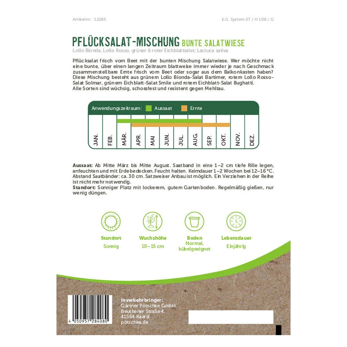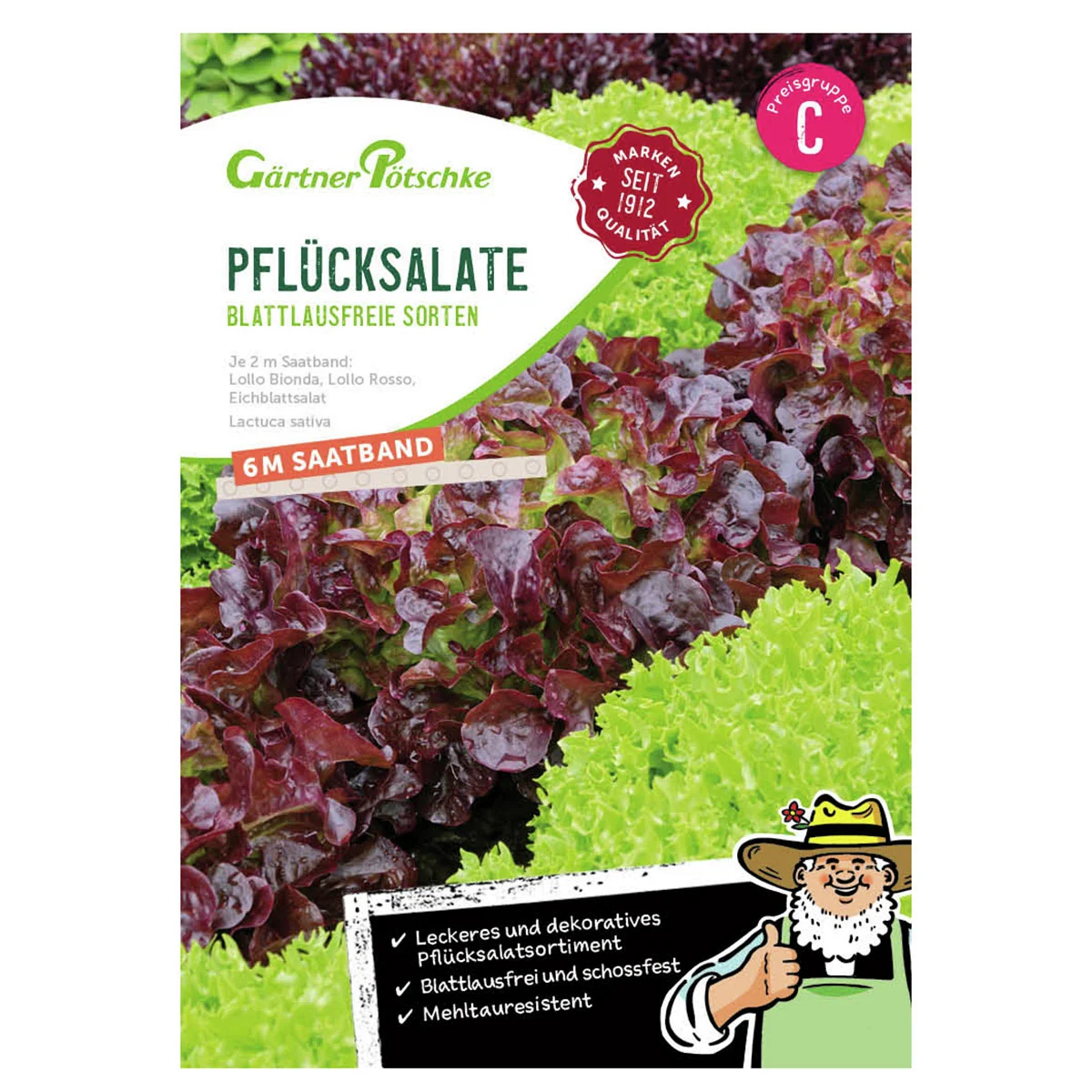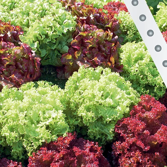 Wer möchte nicht eine bunte, über einen langen Zeitraum blattweise immer wieder je nach Geschmack zusammenstellbare Ernte frisch vom Beet oder sogar aus dem Balkonkasten haben? Diese Mischung besteht aus grünem Lollo Bionda-Salat Bartimer, rotem Lollo Rosso-Salat Solmar, grünem Eichblatt-Salat Smile und rotem Eichblatt-Salat Bughatti. Alle Sorten sind wüchsig, schossfest und resistent gegen Mehltau.