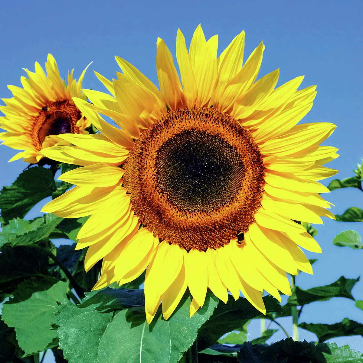 Diese Sonnenblume geizt nicht mit Reizen. Geradewegs nach oben zieht es ihre kräftigen Blütenstängel. Dabei erreicht sie Höhen von stolzen 200–300 cm. Die ebenfalls großen Blätter sind herzförmig. Sie flankieren die Stängel bis hoch hinauf. Als absolute Krönung öffnen sich von Juli bis Oktober die so beliebten, leuchtend gelben Korbblüten mit brauner Mitte, die einen Durchmesser von bis zu 60 cm erreichen können. Hier tummeln sich Bienen und Hummeln, aber auch Schmetterlinge und Co. ausgesprochen gern.