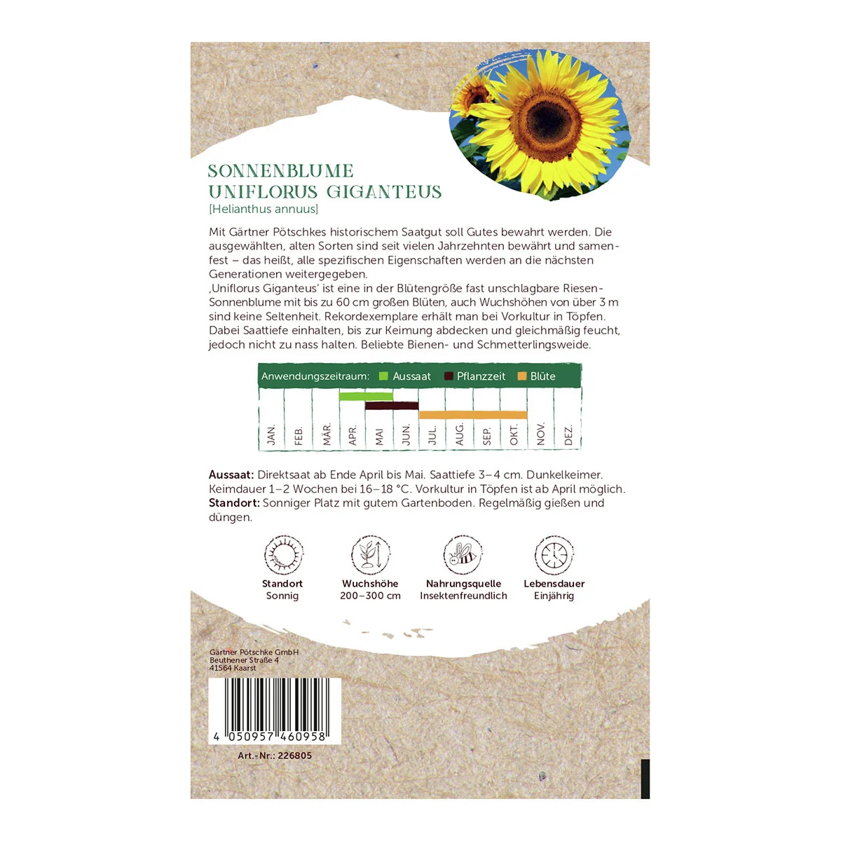 Tipp: Uniflorus Giganteus ist eine in der Blütengröße fast unschlagbare Riesen-Sonnenblume mit bis zu 60 cm großen Blüten. Dabei sind Wuchshöhen von über 3 m keine Seltenheit. Rekord-Exemplare erhält man bei Vorkultur in Töpfen, dabei Saattiefe einhalten, bis zur Keimung abdecken und gleichmäßig feucht, jedoch nicht zu nass halten. Höhe bis 300 cm, einjährig.