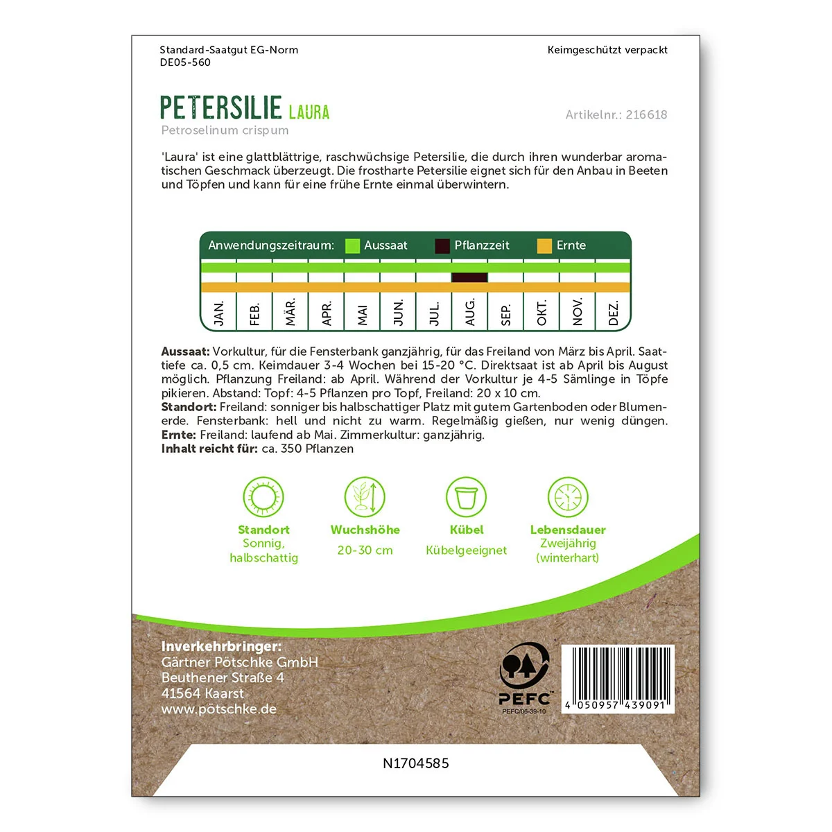 Laura ist eine glattblättrige, raschwüchsige Petersilie, die durch ihren wunderbar aromatischen Geschmack überzeugt. Die frostharte Petersilie eignet sich für den Anbau in Beeten und Töpfen und kann für eine frühe Ernte einmal überwintern.
