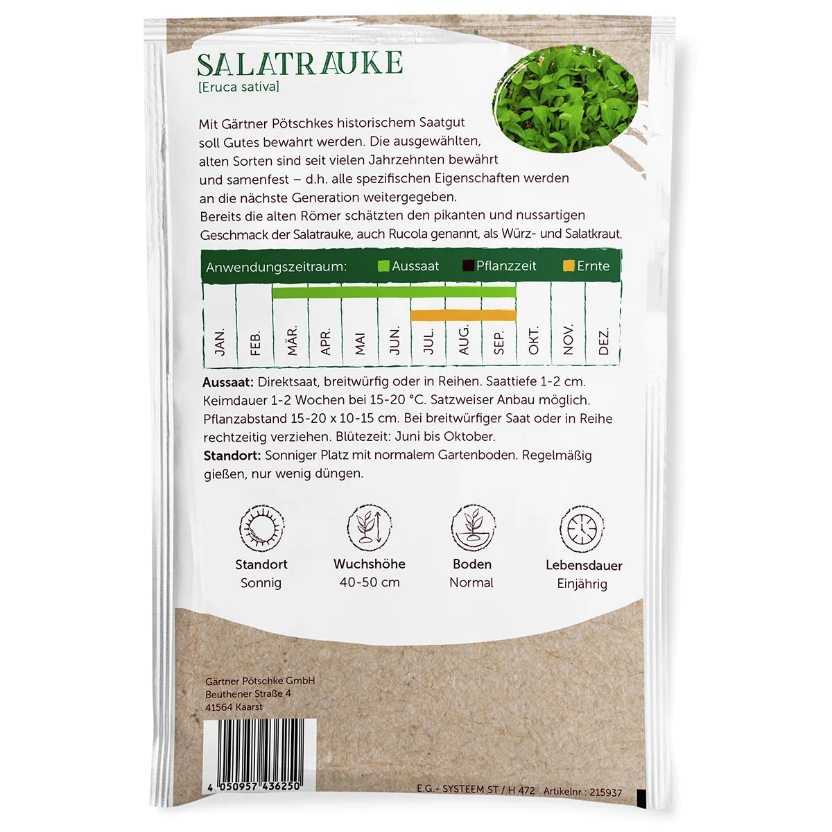 Aussaat: Direktsaat an Ort und Stelle breitwürfig oder in Reihen ab Ende März bis September. Saattiefe 1-2 cm. Keimdauer 1-2 Wochen bei 15-20 °C. Satzweiser Anbau ist möglich.