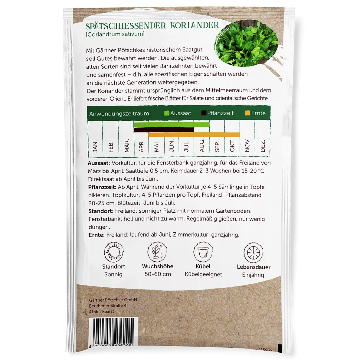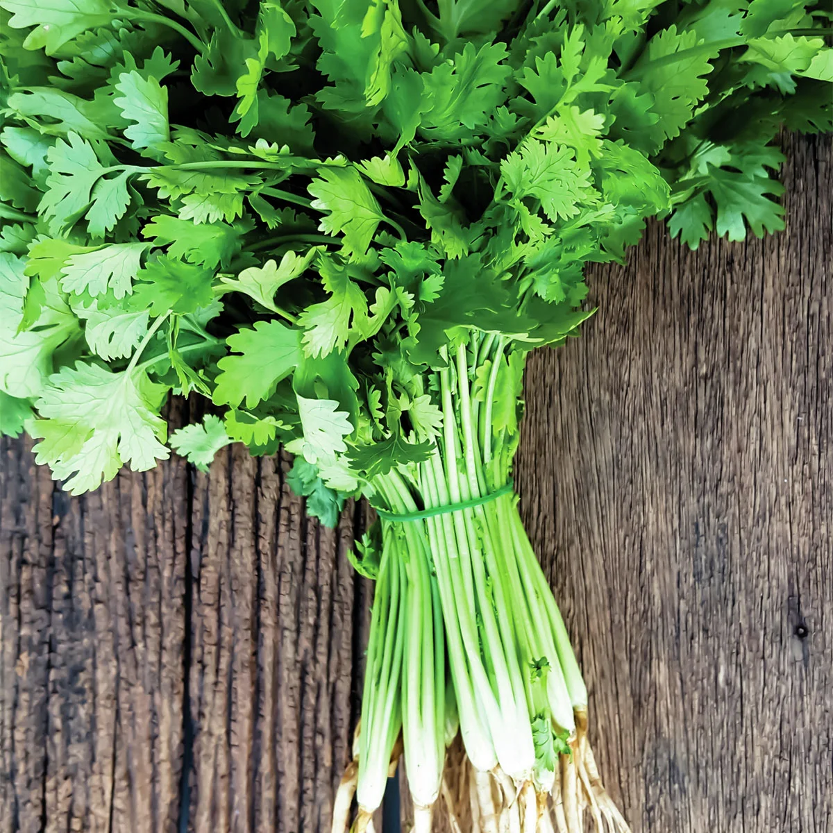Schossfeste Sorte zur Ernte von Koriander-Blättern. Frisch verwenden oder portionsweise einfrieren.