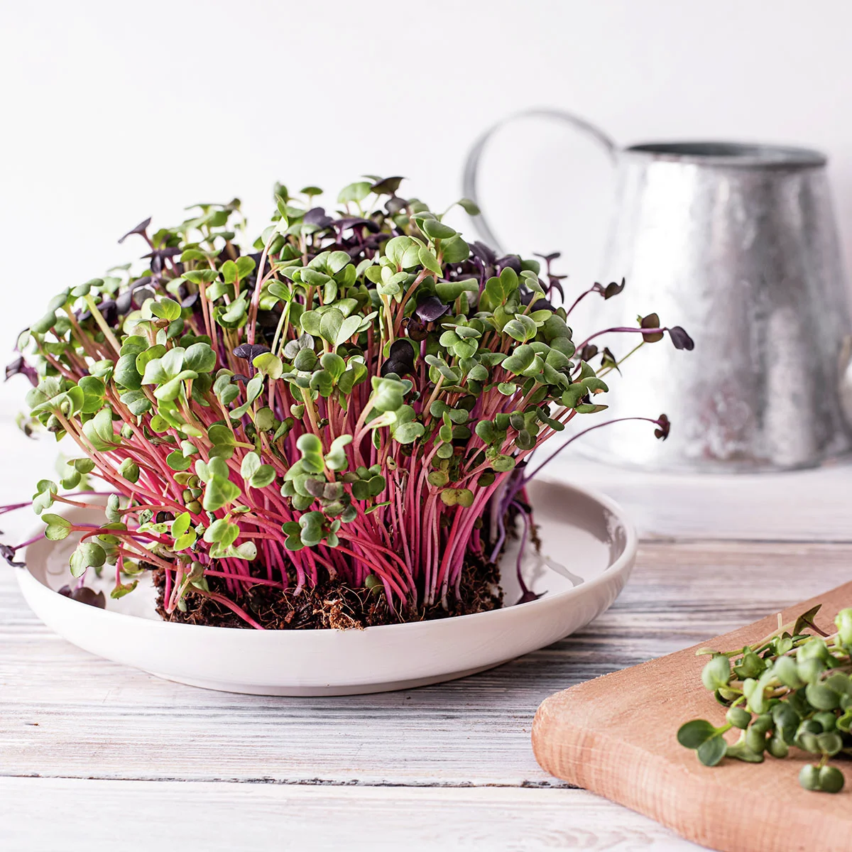 Microgreens sind die essbaren Keimlinge von Gemüsepflanzen, die aus speziell dafür vorgesehenem Saatgut gezogen werden. Durch die Keimung reichern sich besonders viele Nährstoffe in den Pflänzchen an. Daher ist die Konzentration an Vitaminen, Spurenelementen und sekundären Pflanzenstoffen in MicroGreens um ein Vielfaches höher als in ausgewachsenen Gemüsepflanzen. Anders als Sprossen wachsen sie auf Substrat oder aus Samenpads heraus und werden ohne die Wurzel verzehrt. Sie werden auch später geerntet. Wie bei der Kresse, dem bekanntesten MicroGreen, können die Grünkräuter einfach mit einem Messer oder der Küchenschere von der Wurzel getrennt und roh zum Verfeinern und Würzen vielfältiger Speisen genutzt werden. Die Minis lassen sich aus vielen verschiedenen Sorten ziehen. Grünkohl, Radieschen und Co. liefern mal würzig-feine, mal aromatisch-scharfe Aromen und sind mit ihren grünen oder auch roten Blättchen ein toller Blickfang auf dem Teller.