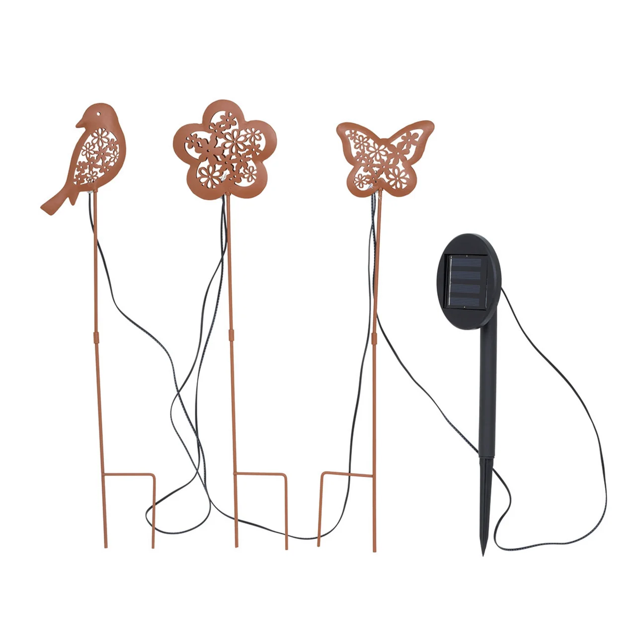 Verleihen Sie Ihrem Garten oder Balkon mit dem LED Solar-Gartenstecker 3er-Set eine bezaubernde, leuchtende Atmosphäre! Dieses Set enthält drei dekorative Gartenstecker mit verschiedenen, filigranen Motiven – Blume, Schmetterling und Vogel. Jedes Motiv ist mit einer warmweißen LED ausgestattet, die die wunderschönen Designs bei Einbruch der Dunkelheit sanft beleuchtet und so für eine stimmungsvolle und einladende Atmosphäre sorgt.