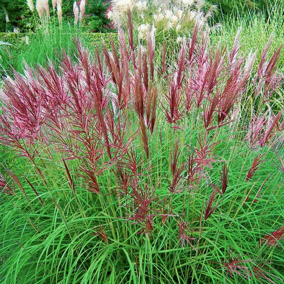 Und zwar das Chinaschilf Red Chief. Denn mit seinen ausgesprochen zierenden, rötlichen Wedeln sowie dem schmal überhängenden, weiß gezeichneten Laub eignet es sich einfach hervorragend für eine Einzelstellung. Aber auch als Hintergrundbepflanzung in einer Staudenrabatte oder am Teichrand macht dieses wertvolle Ziergras eine sehr gute Figur.