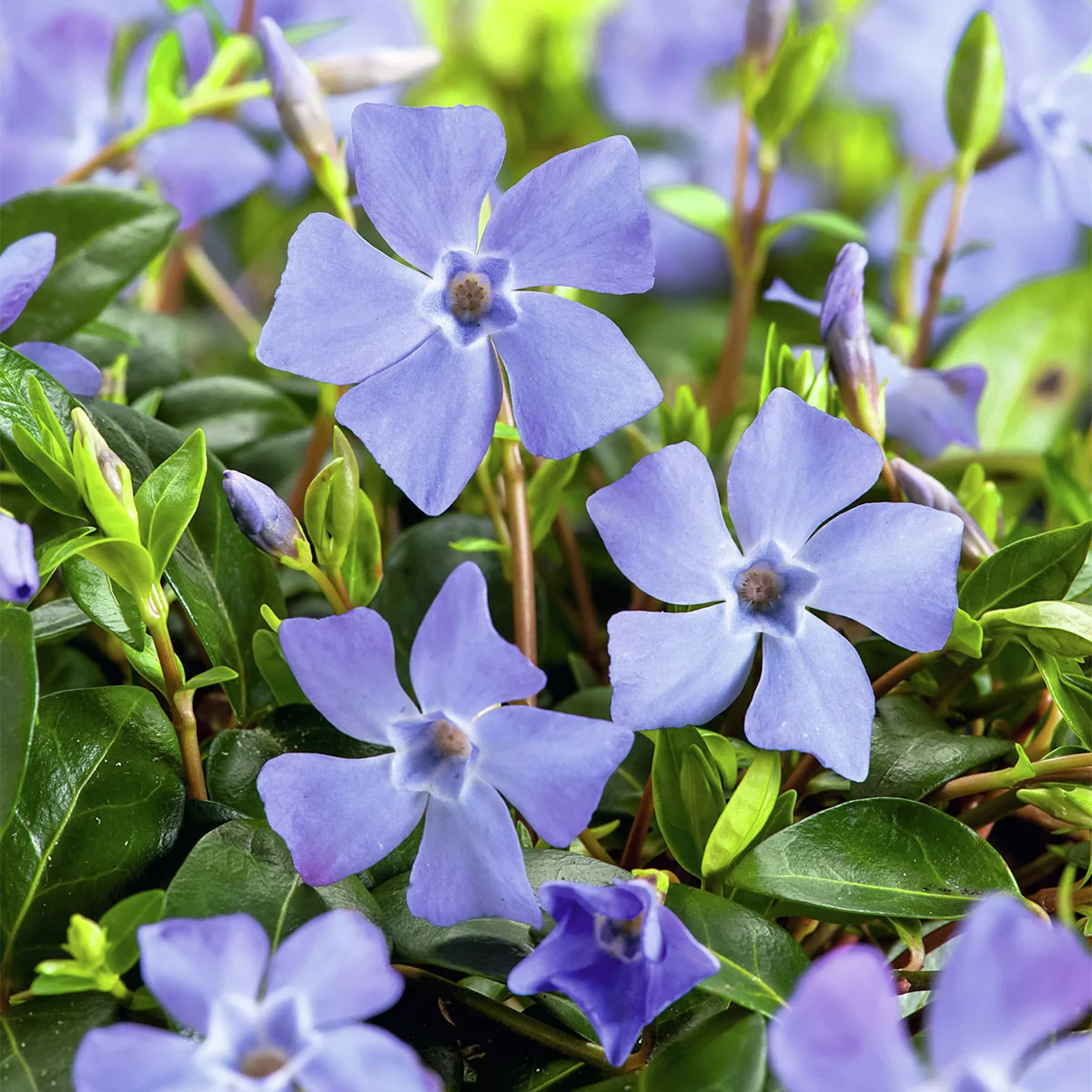 Mit seinem kriechenden, niedrigen Wuchs ist das blaue Immergrün ein perfekter Bodendecker. Es wird nur ca. 5 bis 15 cm hoch, breitet sich dafür aber schnell in die Breite aus. Dank seiner blauen Blütenpracht kann sich das Immergrün auch als Zierpflanze im Schattenbeet sehen lassen. Also kombinieren Sie die robuste Schönheit doch einmal mit Blattschmuck-Funkien und Purpurglöckchen für ein pflegeleichtes wie bezauberndes Ensemble. Für die Verwendung als Bodendecker empfehlen wir 9-12 Pflanzen je m² mit einem Abstand von ca. 20 bis 30 cm.