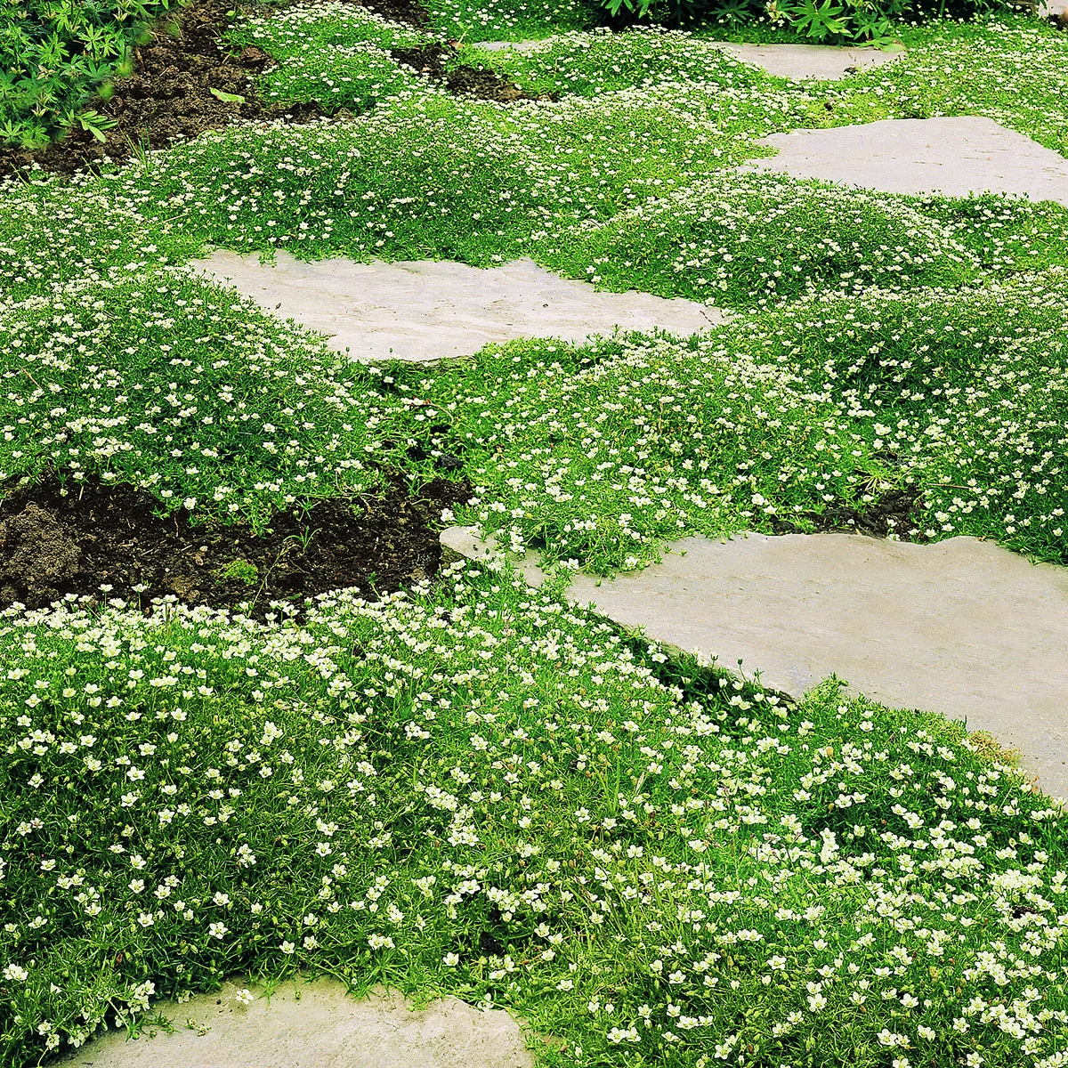 Dicht an dicht stehen die dünnen, nadelartigen Blätter des Sternmooses. Das dunkelgrüne Laub ist es, das dieser Polsterstaude ihren Namen verleiht, obwohl es sich hier eigentlich um ein Mitglied der Familie der Nelkengewächse handelt. Mit der Zeit bildet das Sternmoos einen dichten, ca. 5–10 cm hohen Laubteppich, der zur Blütezeit von Juni bis August mit zahllosen, weißen Blütensternchen besetzt ist. Diese sitzen einzeln auf kurzen Stielen und locken Bienen und andere nützliche Insekten auf eine kleine Verschnaufpause in den Garten. Robust und wintergrün ist es im Garten ganzjährig ein lebendig grüner Blickfang. In Mauerfugen oder Steingärten, als grüne Einfassung für den Gartenweg sowie als pflegeleichte Grabbepflanzung macht das Sternmoos eine gute Figur. Idealerweise wird es dazu in kleinen Gruppen mit etwa 20–30 cm Abstand gepflanzt. Für eine dichte Flächenbegrünung, zum Beispiel als trittfester Rasenersatz, empfehlen wir bei der Neupflanzung etwa 15–18 Pflanzen/m².