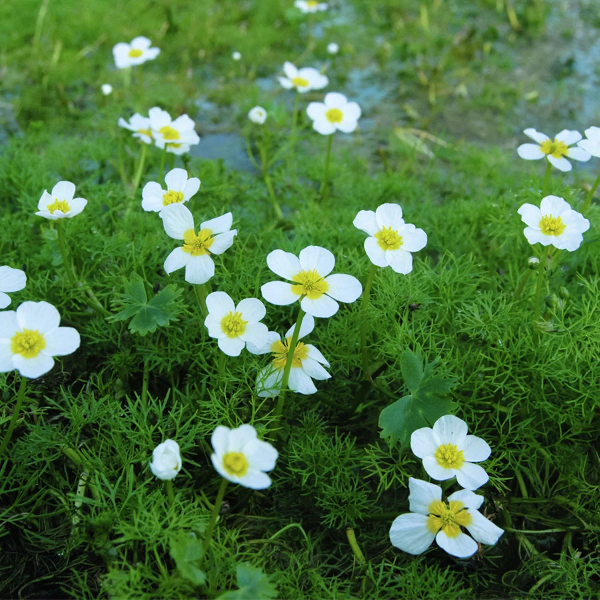 Der Wasserhahnenfuß ist in stehenden und fließenden Gewässern zu finden. Der Großteil der Pflanze befindet sich unter Wasser. Oberhalb der Wasseroberfläche erreicht der Wasser-Hahnenfuß eine Höhe von lediglich etwa fünf Zentimetern, die niedlichen kleinen weißen Blütchen ragen nur knapp aus dem Wasser. Auf der Wasseroberfläche zeigen sich rundlich gelappte Blätter. Das Laub ist fein gefiedert. Auch für Bachlauf und wechselnden Wasserstand gut geeignet. Der Wasser-Hahnenfuß ist äußerst pflegeleicht. Sollte sich die Pflanze zu stark ausbreiten, ist ein Auslichten mühelos möglich. Sehr guter Sauerstoffspender!