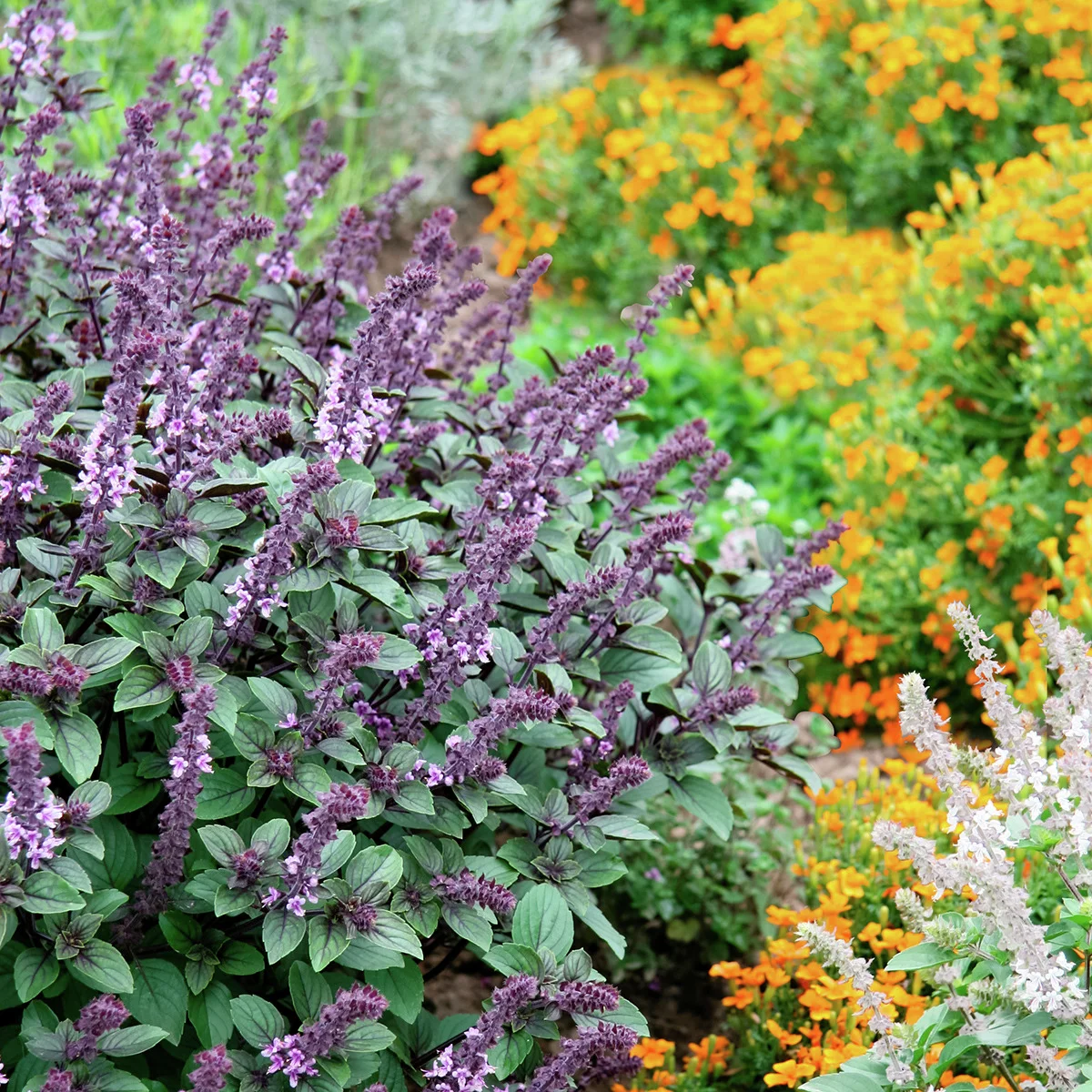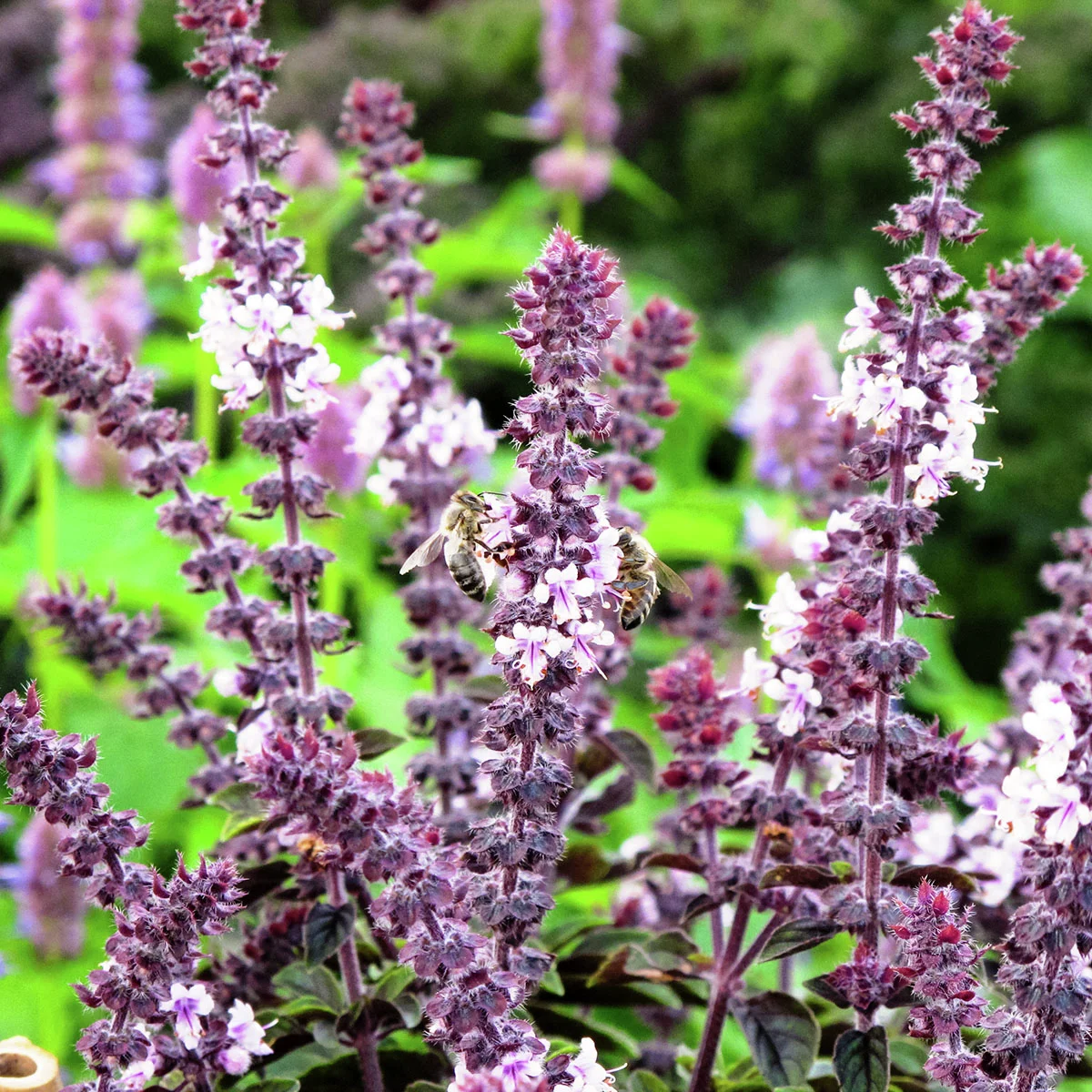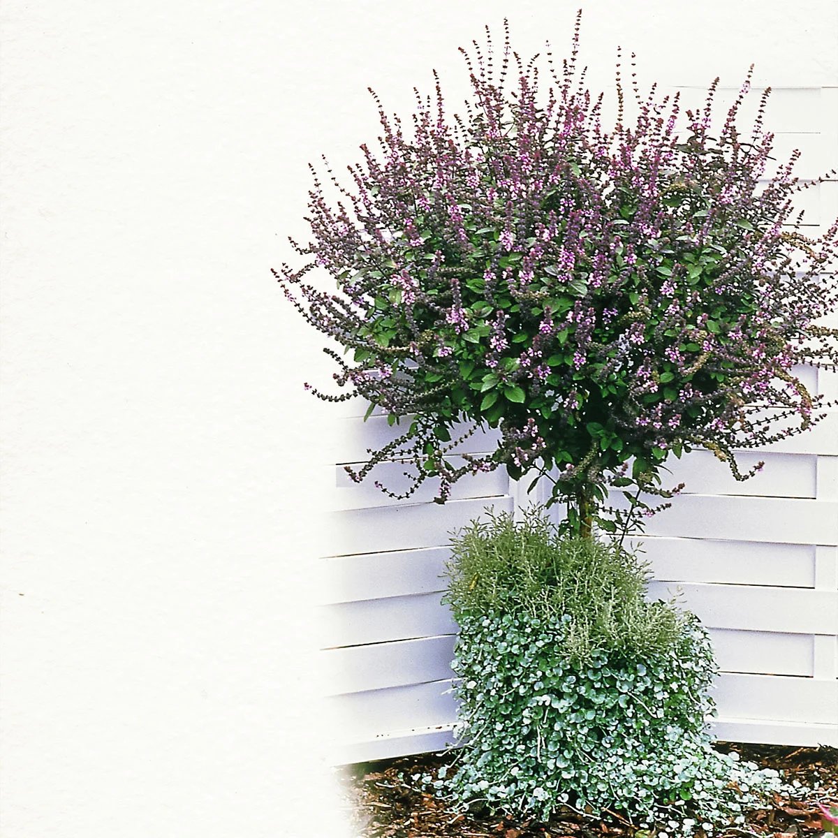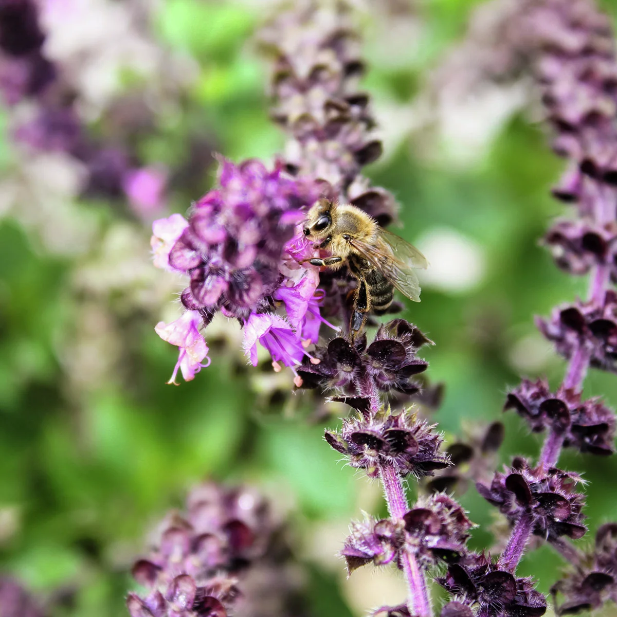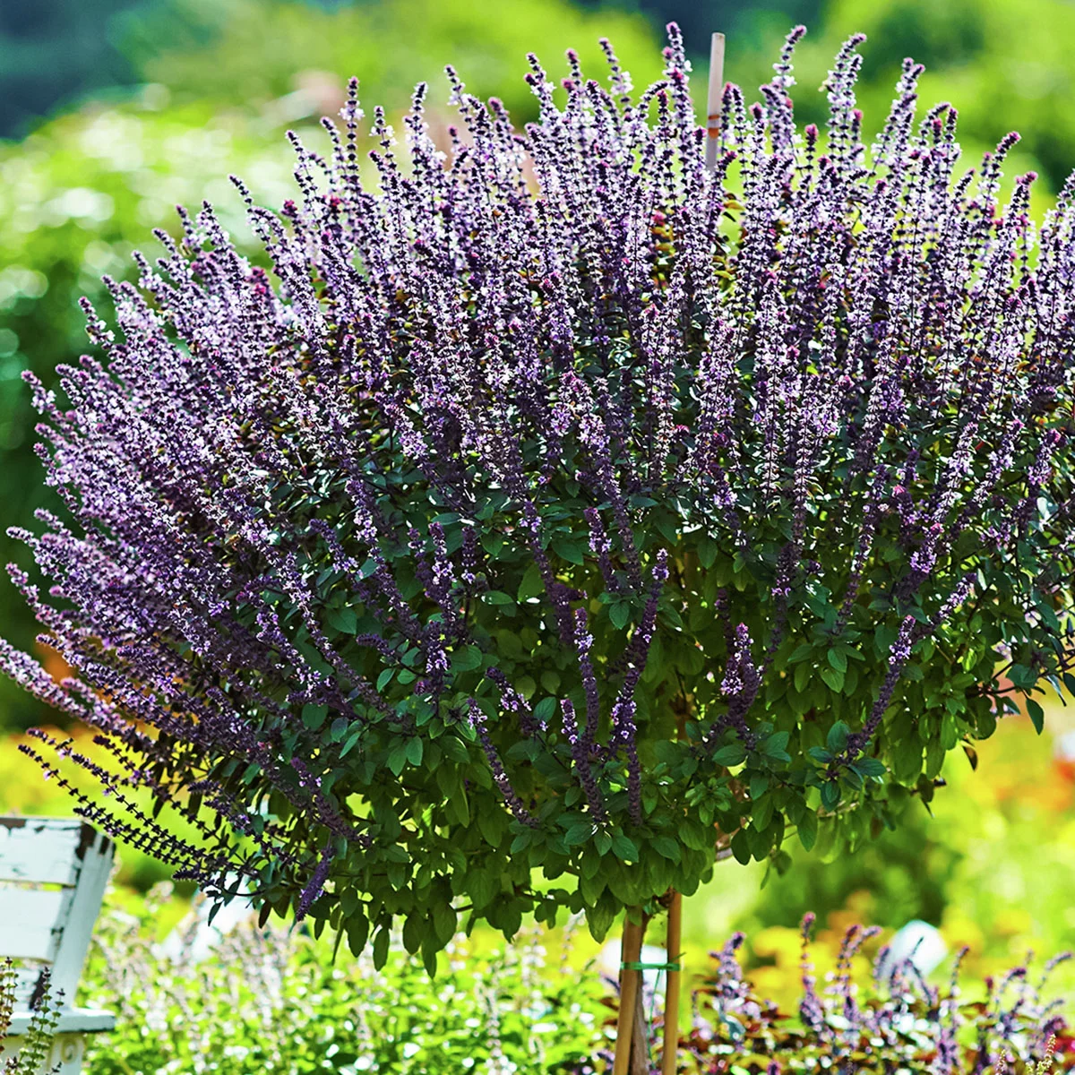 Das Strauchbasilikum liebt einen sonnigen Standort, wächst kräftig und kann z. B. zu einem Busch oder sogar zu einem kleinen Hochstamm geformt werden. Ab Juni dürfen Sie sich außerdem auf hübsche violette Blüten freuen, die Hummeln und Bienen anlocken. In der Küche können Sie das Strauchbasilikum genauso vielseitig verwenden wie herkömmliches Basilikum.