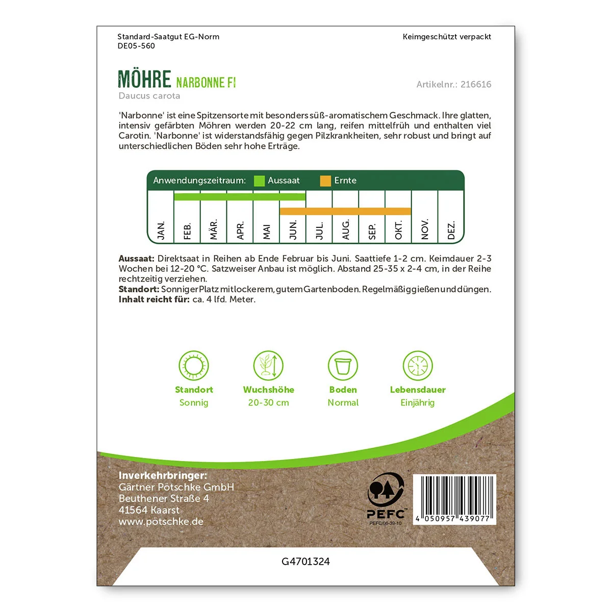 Narbonne ist eine Mini-Finger-Möhre mit rascher Entwicklung für frühe Ernten. Sie überzeugt durch knackige, gut gefärbte Rüben mit vorzüglichem, fein-süßem Geschmack. Für die Freilandsaison, für den frühen Anbau im Frühbeet und auch für größere Töpfe und Balkonkästen geeignet.